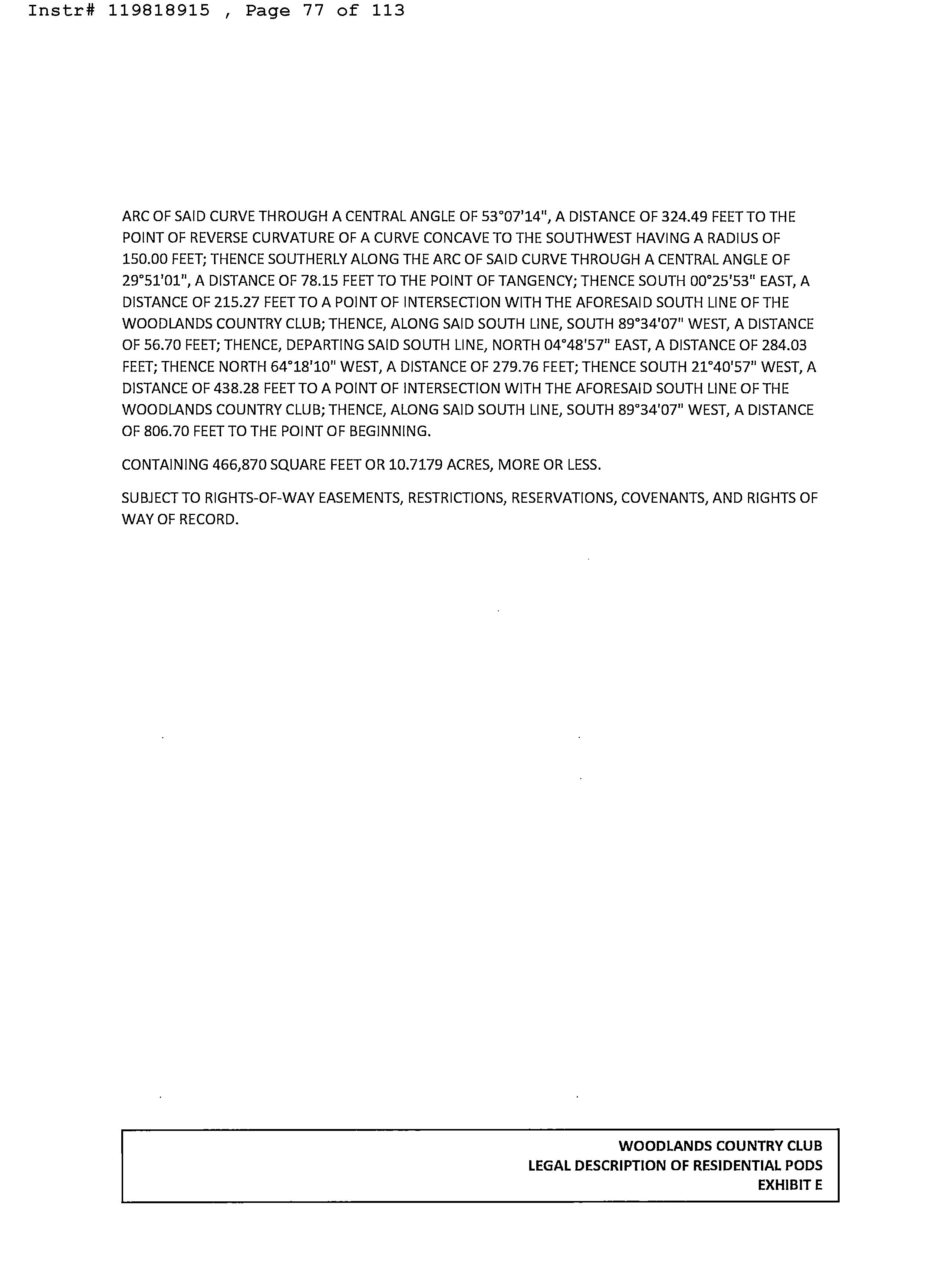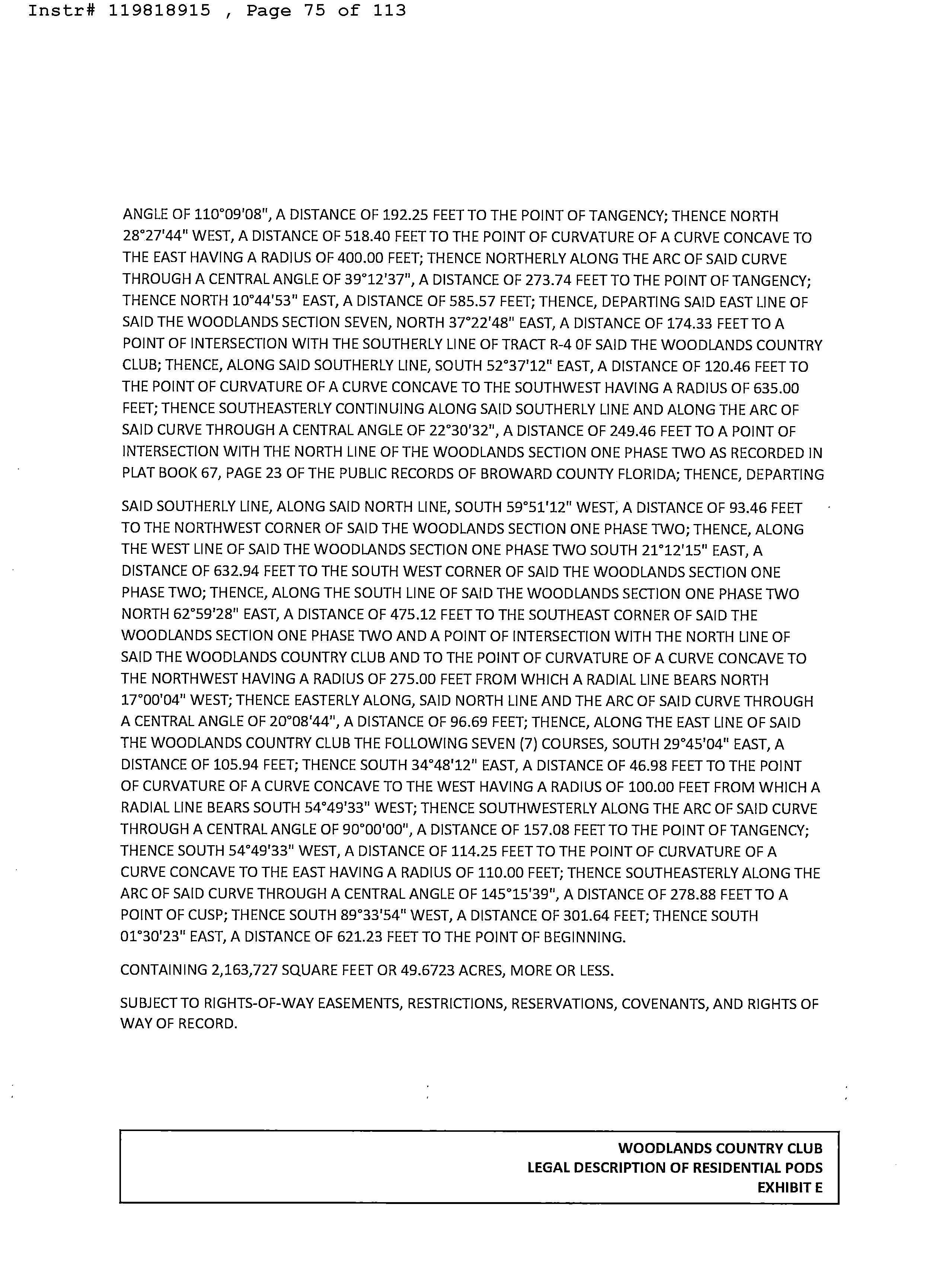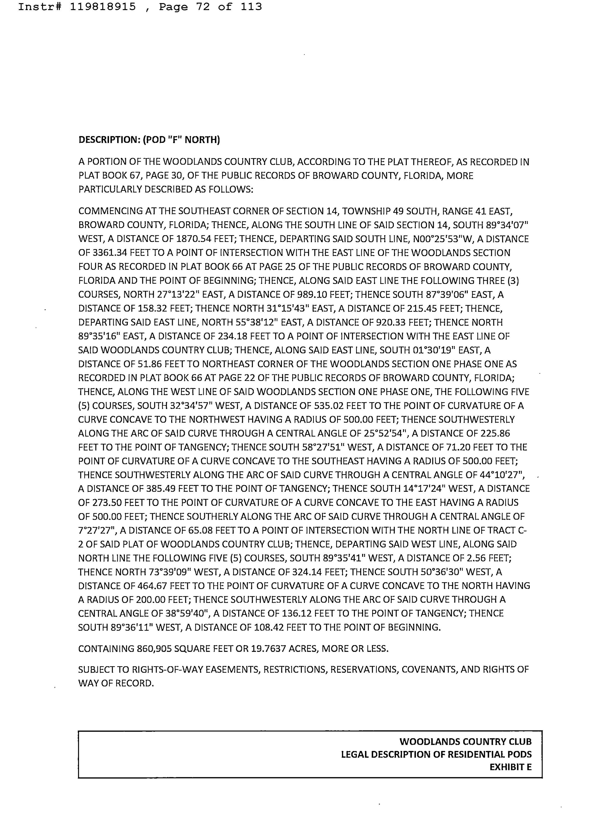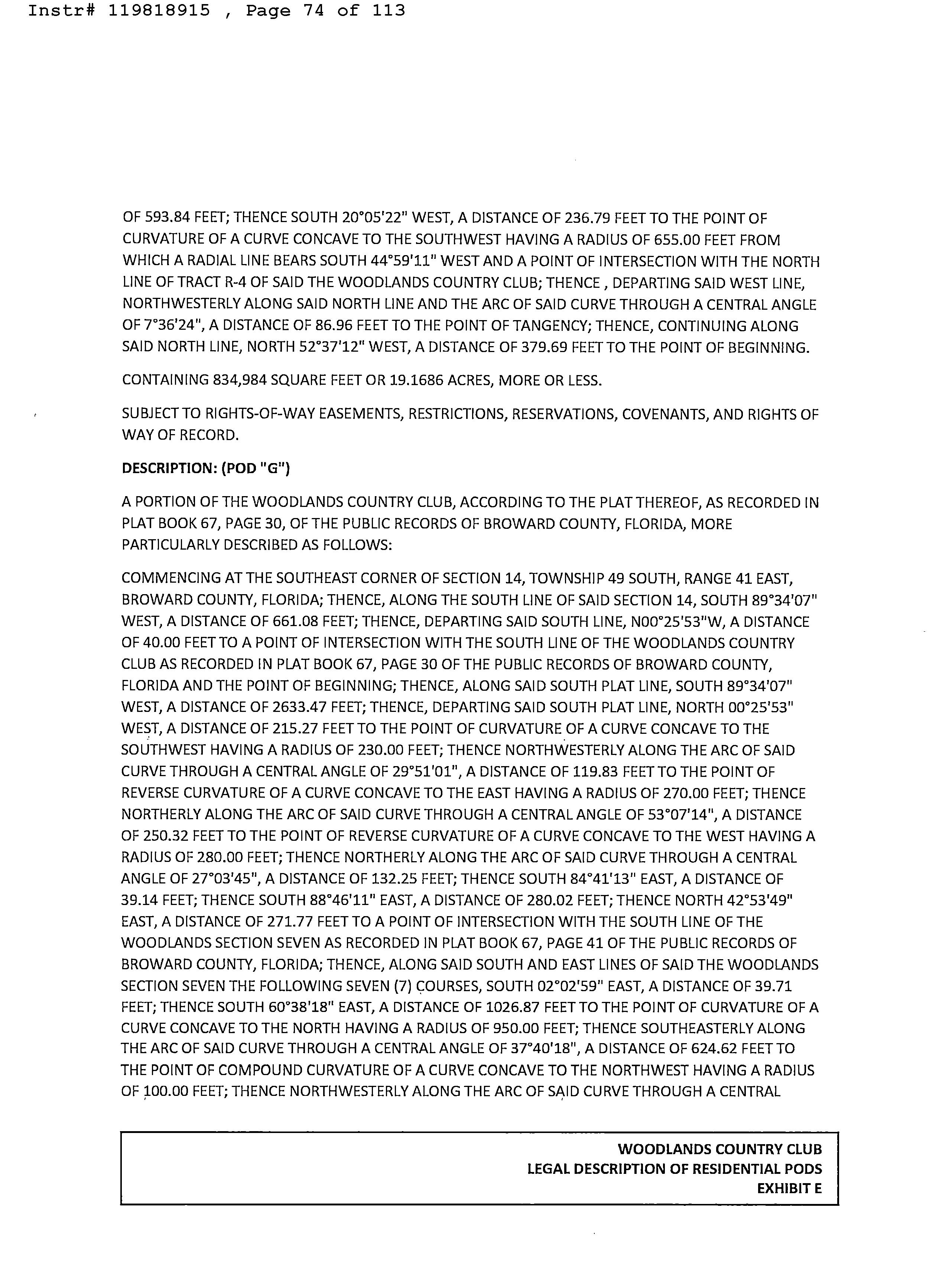 THE OPEN SPACES 1 THROUGH 16 BEING ALL OF WOODLANDS COUNTRY CLUB, ACCORDING TO THE PLAT THEREOF, AS RECORDED IN PLAT BOOK 67, PAGE 30, OF THE PUBLIC RECORDS OF BROWARD COUNTY, FLORIDA, LESS AND EXCEPT PARCELS, A, B, C, D, E, F, G, H, H, I, J, L, M, AND N, TRACTS R-1 THROUGH R-11, INCLUSIVE, TRACTS C-1, C-2 AND C-3 AND TRACT L-1, AND FURTHER LESS AND EXCEPT THOSE PORTIONS INCLUDED IN DEEDS RECORDED IN OFFICIAL RECORDS BOOK 5337, PAGE 607, OFFICIAL RECORDS BOOK 12713, PAGE 821 AND OFFICIAL RECORDS BOOK 38923, PAGE 1547, OF THE PUBLIC RECORDS OF BROWARD COUNTY, FLORIDA.