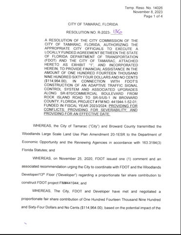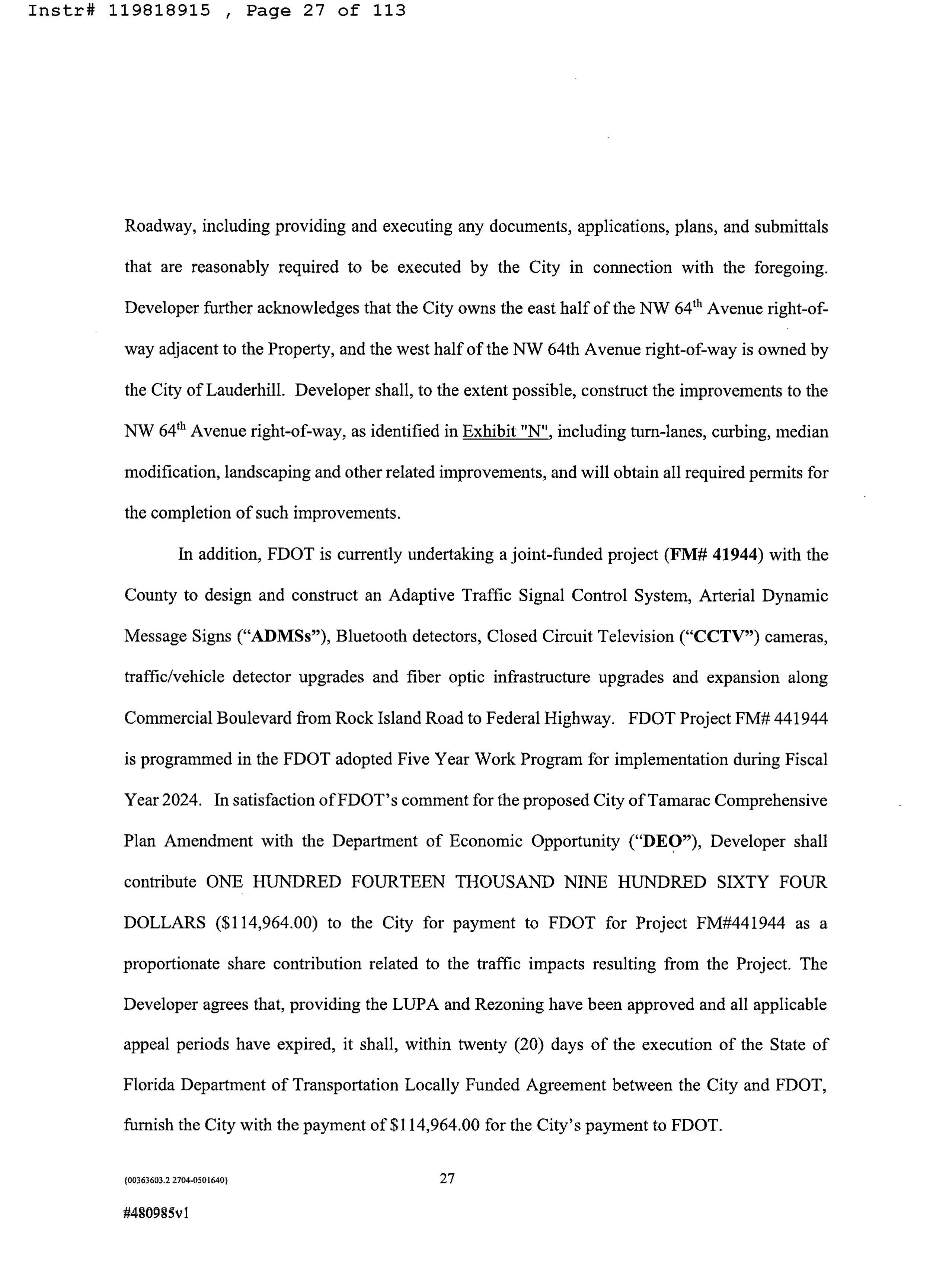 In addition, FDOT is currently undertaking a joint -funded project ( FM# 41944) with the County to design and construct an Adaptive Traffic Signal Control System, Arterial Dynamic Message Signs (" ADMSs"), Bluetooth detectors, Closed Circuit Television (" CCTV") cameras, traffic/ vehicle detector upgrades and fiber optic infrastructure upgrades and expansion along Commercial Boulevard from Rock Island Road to Federal Highway. FDOT Project FM# 441944 is programmed in the FDOT adopted Five Year Work Program for implementation during Fiscal Year 2024. In satisfaction ofFDOT' s comment for the proposed City of Tamarac Comprehensive Plan Amendment with the Department of Economic Opportunity (" DEO"), Developer shall contribute ONE HUNDRED FOURTEEN THOUSAND NINE HUNDRED SIXTY FOUR