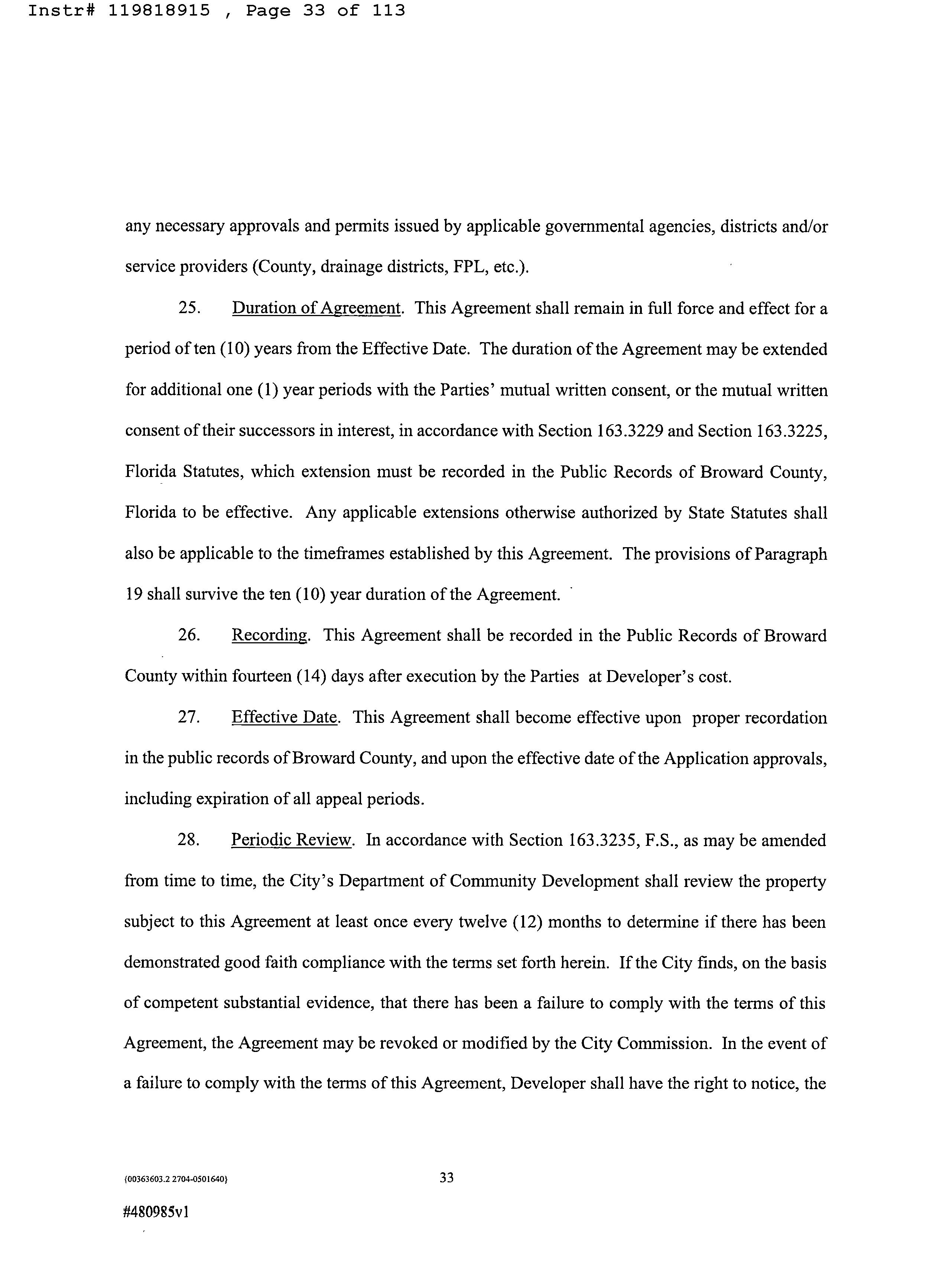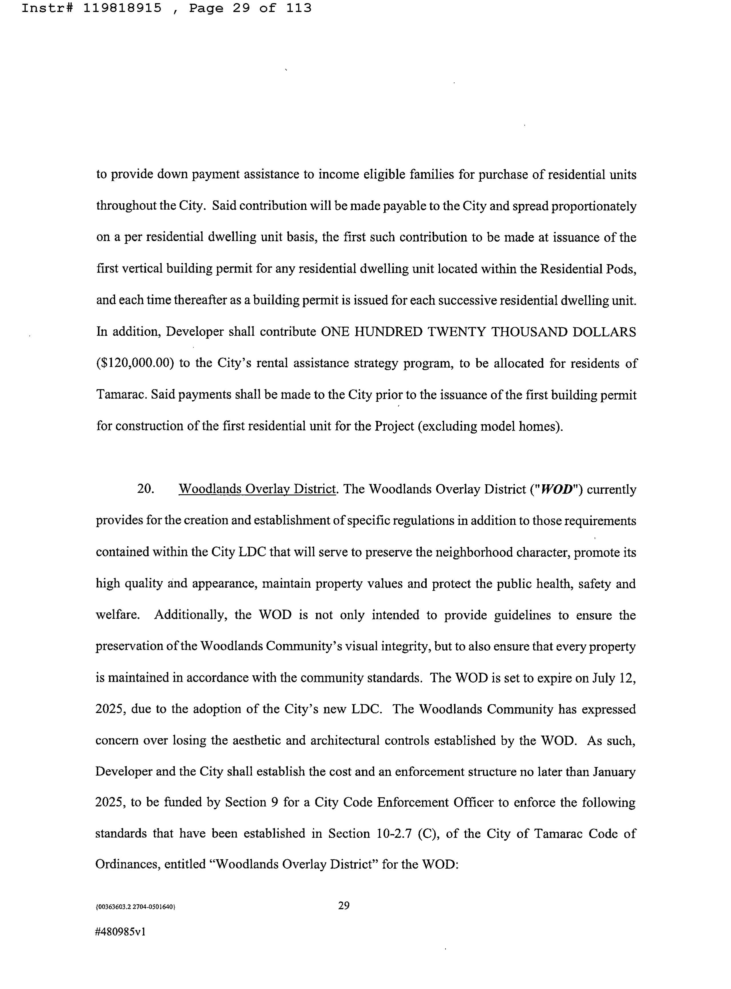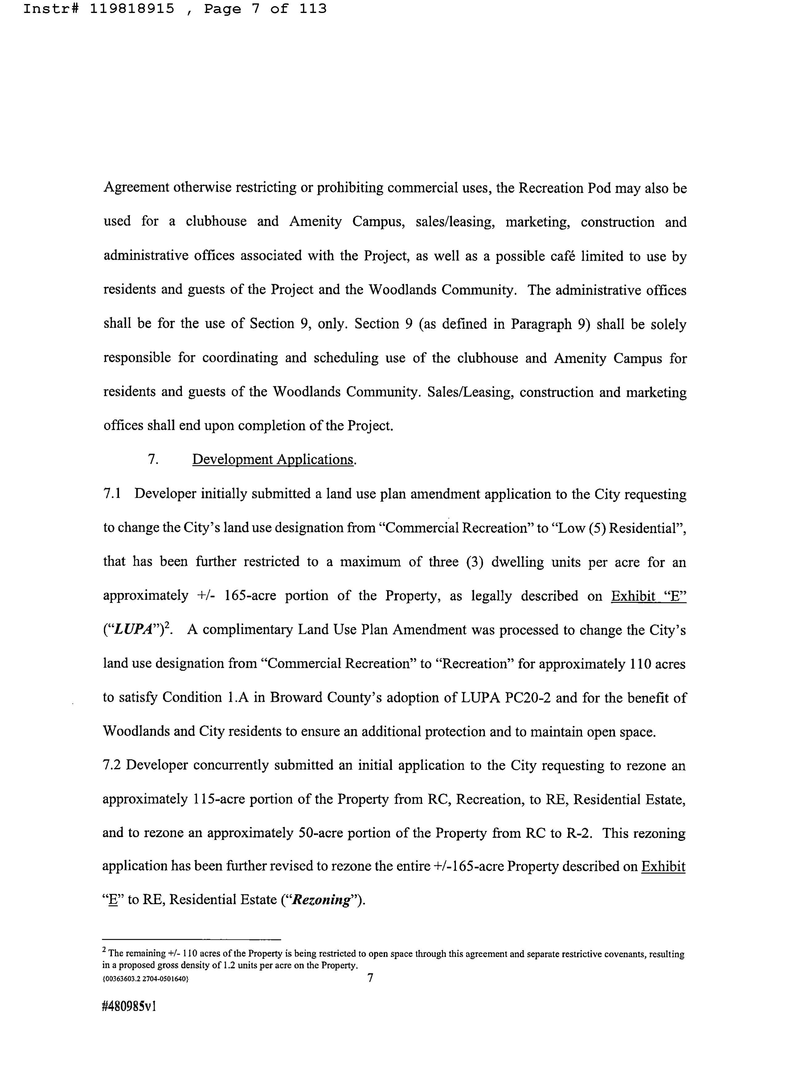 7. 1 Developer initially submitted a land use plan amendment application to the City requesting to change the City' s land use designation from " Commercial Recreation" to "Low (5) Residential", that has been further restricted to a maximum of three ( 3) dwelling units per acre for an approximately +/- 165- acre portion of the Property, as legally described on Exhibit " E" LUPA") 2. A complimentary Land Use Plan Amendment was processed to change the City' s land use designation from " Commercial Recreation" to " Recreation" for approximately 110 acres to satisfy Condition LA in Broward County' s adoption of LUPA PC20- 2 and for the benefit of Woodlands and City residents to ensure an additional protection and to maintain open space.