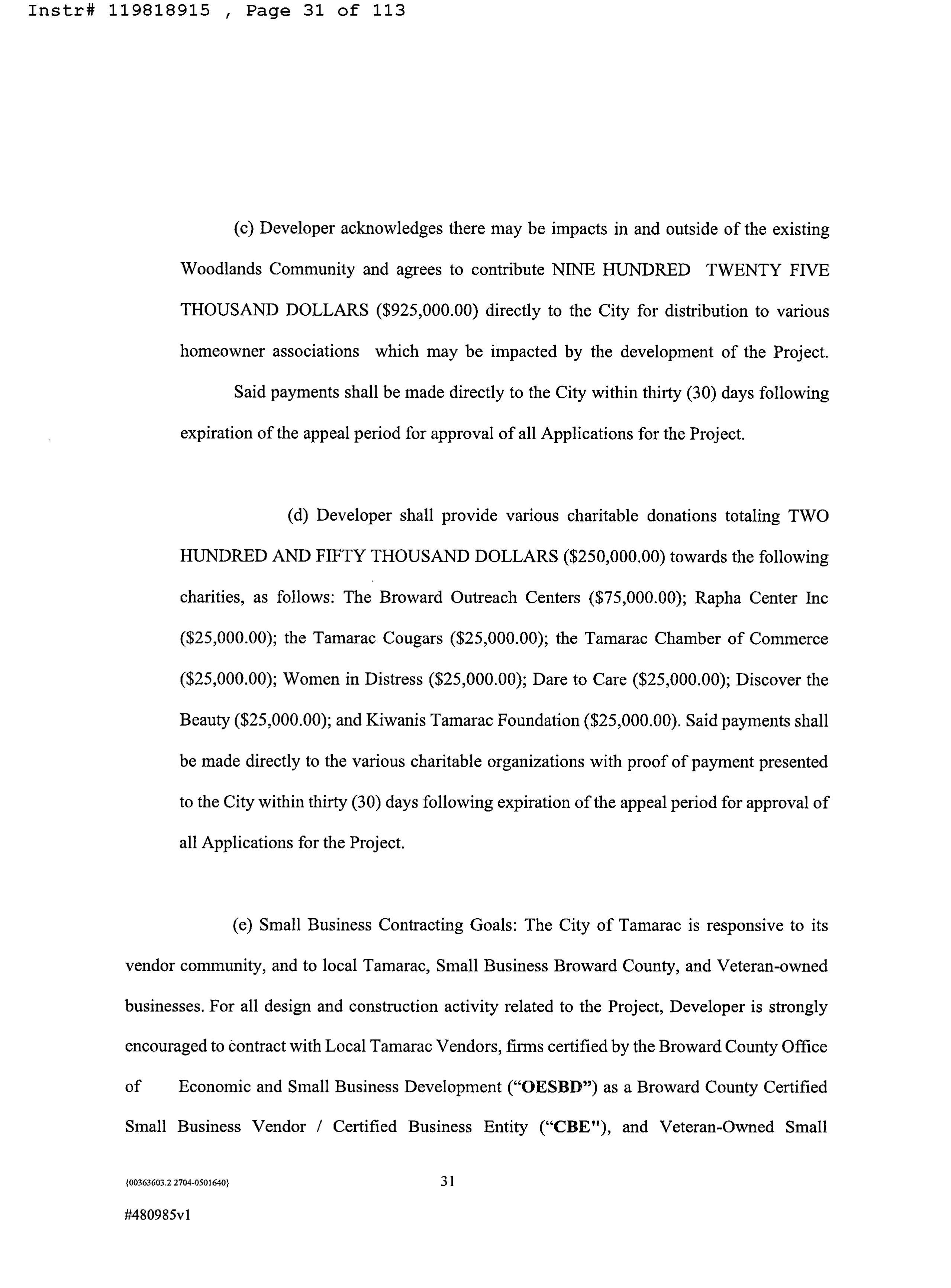 DOLLARS ($ 114, 964. 00) to the City for payment to FDOT for Project FM#441944 as a proportionate share contribution related to the traffic impacts resulting from the Project. The Developer agrees that, providing the LUPA and Rezoning have been approved and all applicable appeal periods have expired, it shall, within twenty ( 20) days of the execution of the State of Florida Department of Transportation Locally Funded Agreement between the City and FDOT, furnish the City with the payment of $114,964.00 for the City' s payment to FDOT. 00363603.