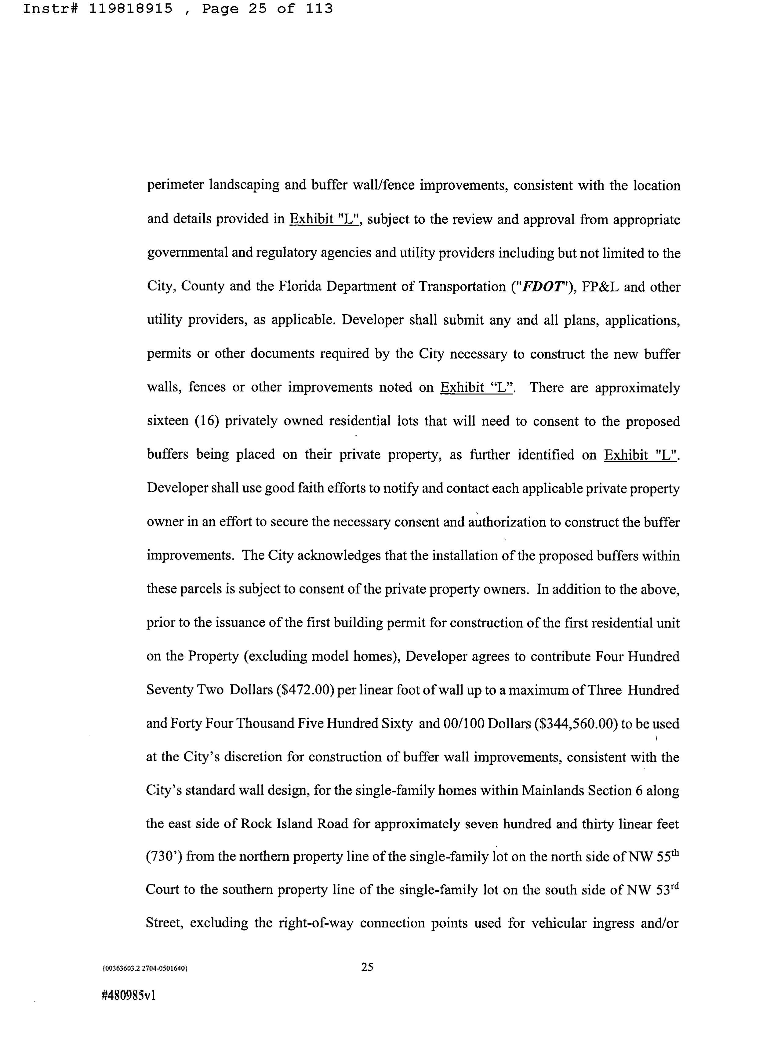 perimeter landscaping and buffer wall/ fence improvements, consistent with the location and details provided in Exhibit " L", subject to the review and approval from appropriate governmental and regulatory agencies and utility providers including but not limited to the City, County and the Florida Department of Transportation (" FAOT" ), FP& L and other utility providers, as applicable. Developer shall submit any and all plans, applications, permits or other documents required by the City necessary to construct the new buffer walls, fences or other improvements noted on Exhibit " L". There are approximately sixteen ( 16) privately owned residential lots that will need to consent to the proposed buffers being placed on their private property, as further identified on Exhibit " U. Developer shall use good faith efforts to notify and contact each applicable private property owner in an effort to secure the necessary consent and authorization to construct the buffer improvements. The City acknowledges that the installation ofthe proposed buffers within these parcels is subject to consent of the private property owners. In addition to the above, prior to the issuance ofthe first building permit for construction ofthe first residential unit on the Property ( excluding model homes), Developer agrees to contribute Four Hundred Seventy Two Dollars ($472. 00) per linear foot ofwall up to a maximum of Three Hundred and Forty Four Thousand Five Hundred Sixty and 00/ 100 Dollars ($ 344, 560. 00) to be used at the City' s discretion for construction of buffer wall improvements, consistent with the City' s standard wall design, for the single-family homes within Mainlands Section 6 along the east side of Rock Island Road for approximately seven hundred and thirty linear feet 730') from the northern property line of the single- family lot on the north side of NW 551b Court to the southern property line of the single- family lot on the south side of NW 53rd Street, excluding the right-of-way connection points used for vehicular ingress and/ or