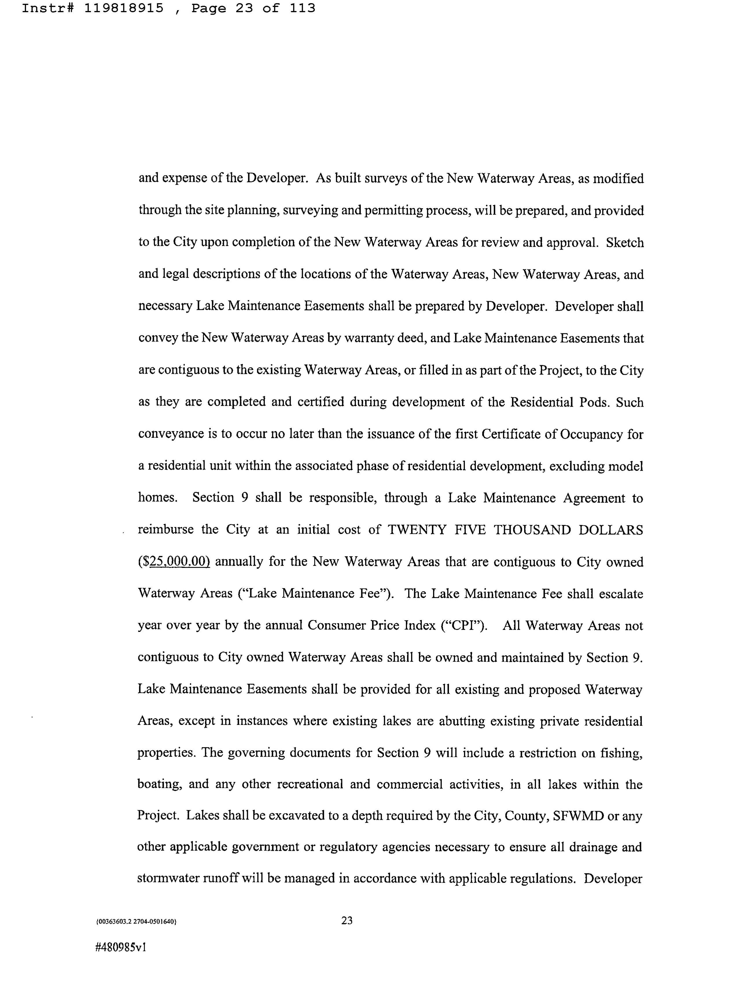and expense of the Developer. As built surveys ofthe New Waterway Areas, as modified through the site planning, surveying and permitting process, will be prepared, and provided to the City upon completion of the New Waterway Areas for review and approval. Sketch and legal descriptions of the locations of the Waterway Areas, New Waterway Areas, and necessary Lake Maintenance Easements shall be prepared by Developer. Developer shall convey the New Waterway Areas by warranty deed, and Lake Maintenance Easements that are contiguous to the existing Waterway Areas, or filled in as part ofthe Project, to the City as they are completed and certified during development of the Residential Pods. Such conveyance is to occur no later than the issuance of the first Certificate of Occupancy for a residential unit within the associated phase ofresidential development, excluding model homes. Section 9 shall be responsible, through a Lake Maintenance Agreement to reimburse the City at an initial cost of TWENTY FIVE THOUSAND DOLLARS
