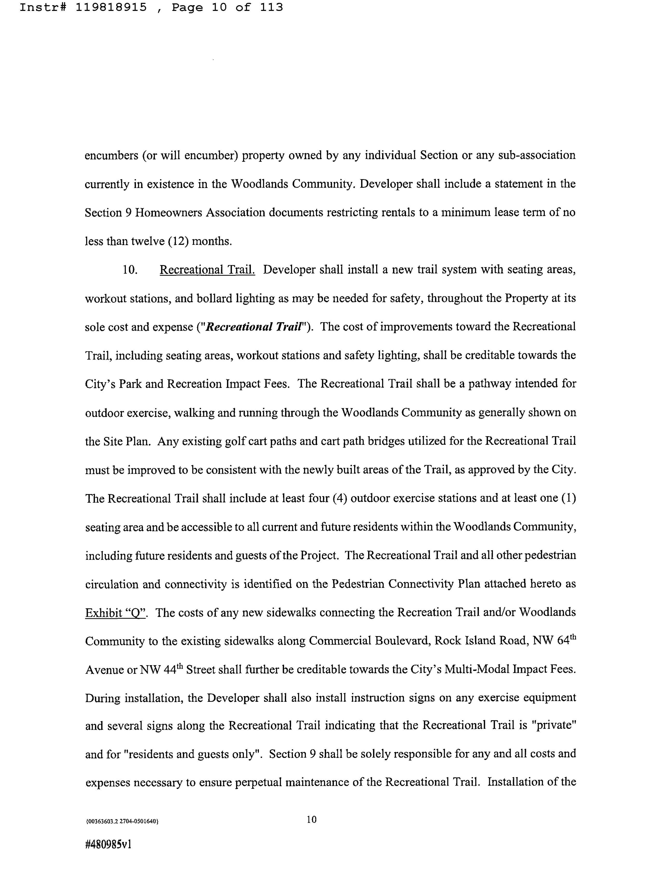 10. Recreational Trail. Developer shall install a new trail system with seating areas, workout stations, and bollard lighting as may be needed for safety, throughout the Property at its sole cost and expense (" Recreational Tiail"). The cost of improvements toward the Recreational Trail, including seating areas, workout stations and safety lighting, shall be creditable towards the City' s Park and Recreation Impact Fees. The Recreational Trail shall be a pathway intended for outdoor exercise, walking and running through the Woodlands Community as generally shown on the Site Plan. Any existing golf cart paths and cart path bridges utilized for the Recreational Trail must be improved to be consistent with the newly built areas of the Trail, as approved by the City. The Recreational Trail shall include at least four (4) outdoor exercise stations and at least one ( 1) seating area and be accessible to all current and future residents within the Woodlands Community, including future residents and guests ofthe Project. The Recreational Trail and all other pedestrian circulation and connectivity is identified on the Pedestrian Connectivity Plan attached hereto as