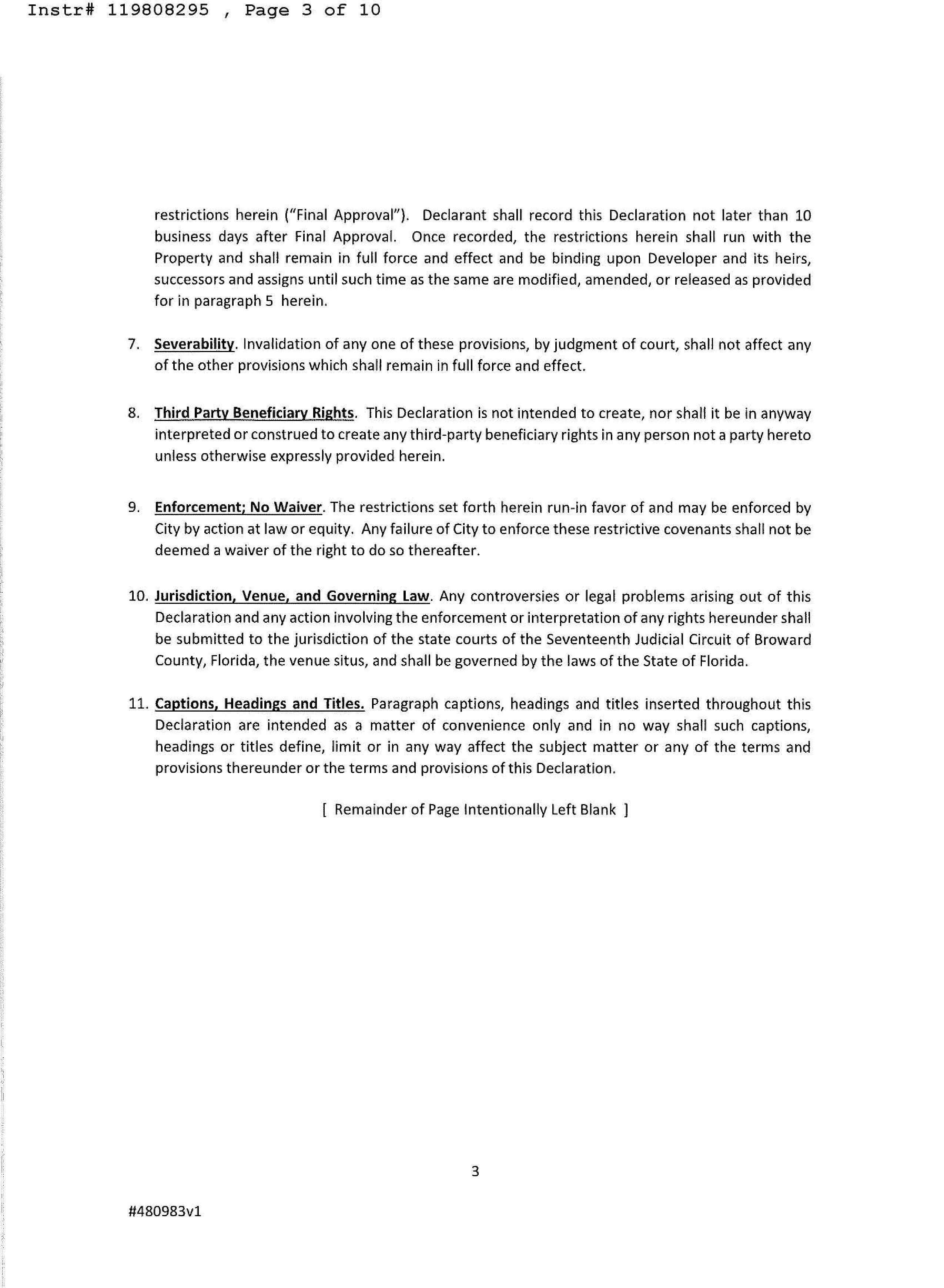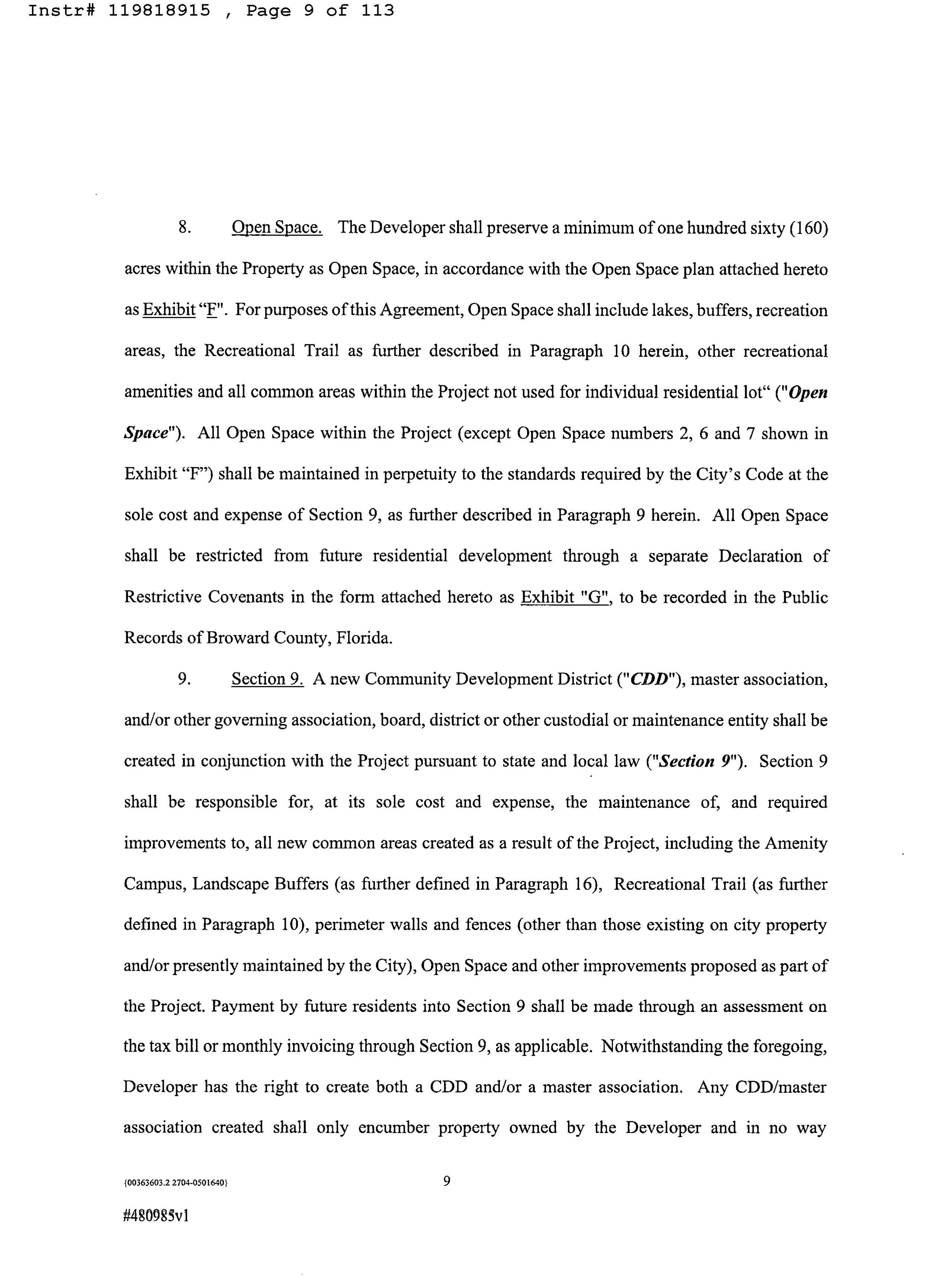 8. Open Space. The Developer shall preserve a minimum of one hundred sixty ( 160) acres within the Property as Open Space, in accordance with the Open Space plan attached hereto as Exhibit " F". For purposes ofthis Agreement, Open Space shall include lakes, buffers, recreation areas, the Recreational Trail as further described in Paragraph 10 herein, other recreational amenities and all common areas within the Project not used for individual residential lot" (" Open Space"). All Open Space within the Project ( except Open Space numbers 2, 6 and 7 shown in Exhibit " F") shall be maintained in perpetuity to the standards required by the City' s Code at the sole cost and expense of Section 9, as further described in Paragraph 9 herein. All Open Space shall be restricted from future residential development through a separate Declaration of Restrictive Covenants in the form attached hereto as Exhibit " G", to be recorded in the Public Records of Broward County, Florida.