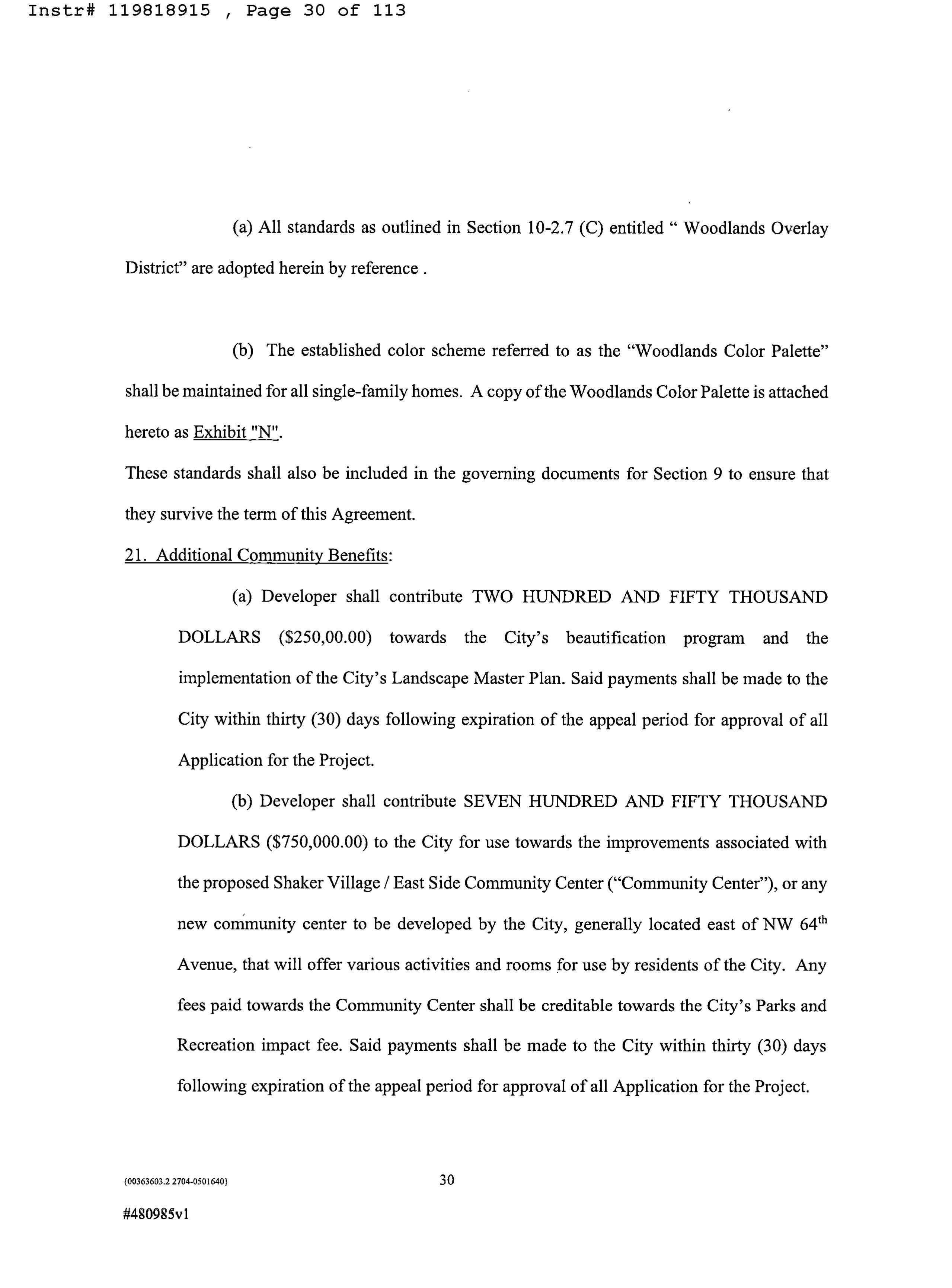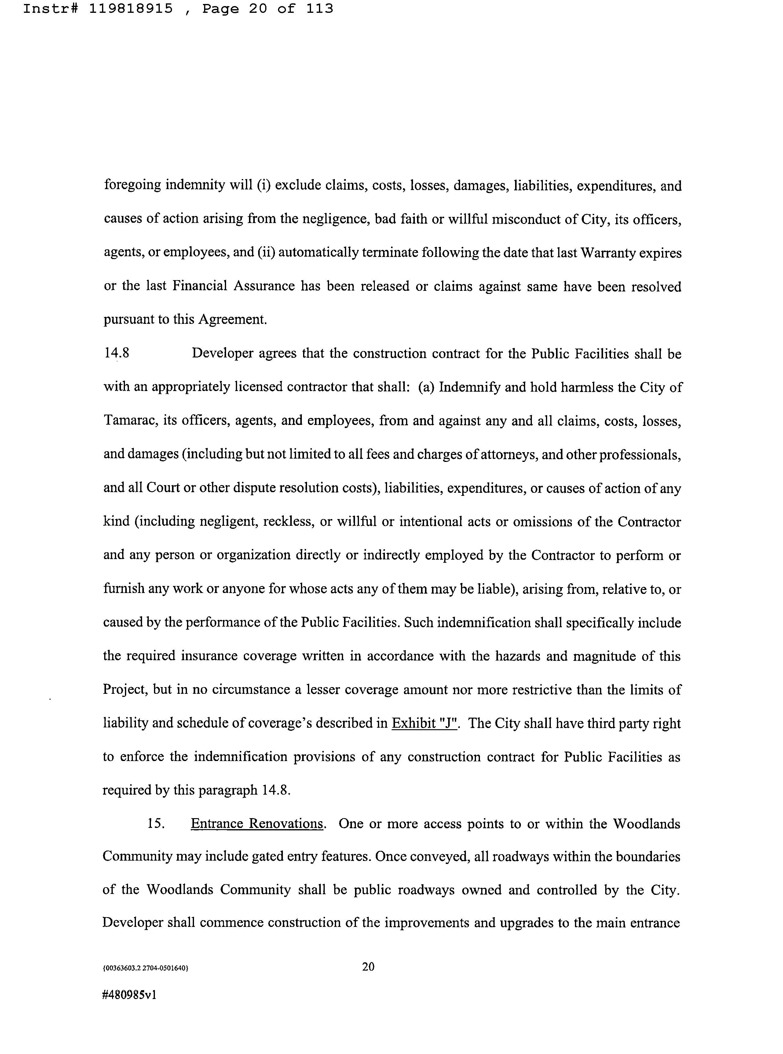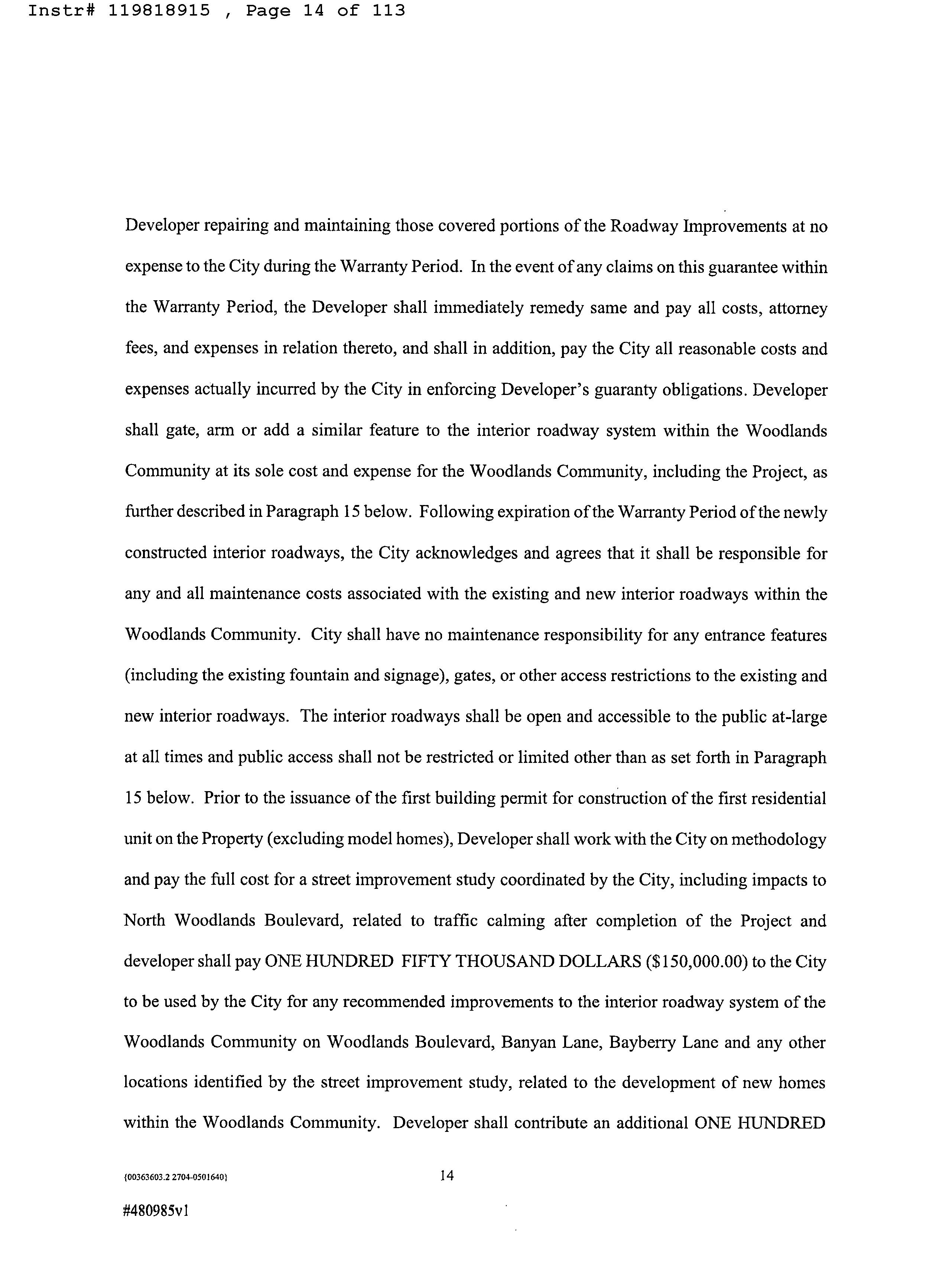 Developer repairing and maintaining those covered portions of the Roadway Improvements at no expense to the City during the Warranty Period. In the event ofany claims on this guarantee within the Warranty Period, the Developer shall immediately remedy same and pay all costs, attorney fees, and expenses in relation thereto, and shall in addition, pay the City all reasonable costs and expenses actually incurred by the City in enforcing Developer' s guaranty obligations. Developer shall gate, arm or add a similar feature to the interior roadway system within the Woodlands Community at its sole cost and expense for the Woodlands Community, including the Project, as further described in Paragraph 15 below. Following expiration ofthe Warranty Period ofthe newly constructed interior roadways, the City acknowledges and agrees that it shall be responsible for any and all maintenance costs associated with the existing and new interior roadways within the Woodlands Community. City shall have no maintenance responsibility for any entrance features including the existing fountain and signage), gates, or other access restrictions to the existing and new interior roadways. The interior roadways shall be open and accessible to the public at -large at all times and public access shall not be restricted or limited other than as set forth in Paragraph 15 below. Prior to the issuance of the first building permit for construction of the first residential unit on the Property (excluding model homes), Developer shall work with the City on methodology and pay the full cost for a street improvement study coordinated by the City, including impacts to North Woodlands Boulevard, related to traffic calming after completion of the Project and developer shall pay ONE HUNDRED FIFTY THOUSAND DOLLARS ($ 150,000.00) to the City to be used by the City for any recommended improvements to the interior roadway system of the Woodlands Community on Woodlands Boulevard, Banyan Lane, Bayberry Lane and any other locations identified by the street improvement study, related to the development of new homes within the Woodlands Community. Developer shall contribute an additional ONE HUNDRED