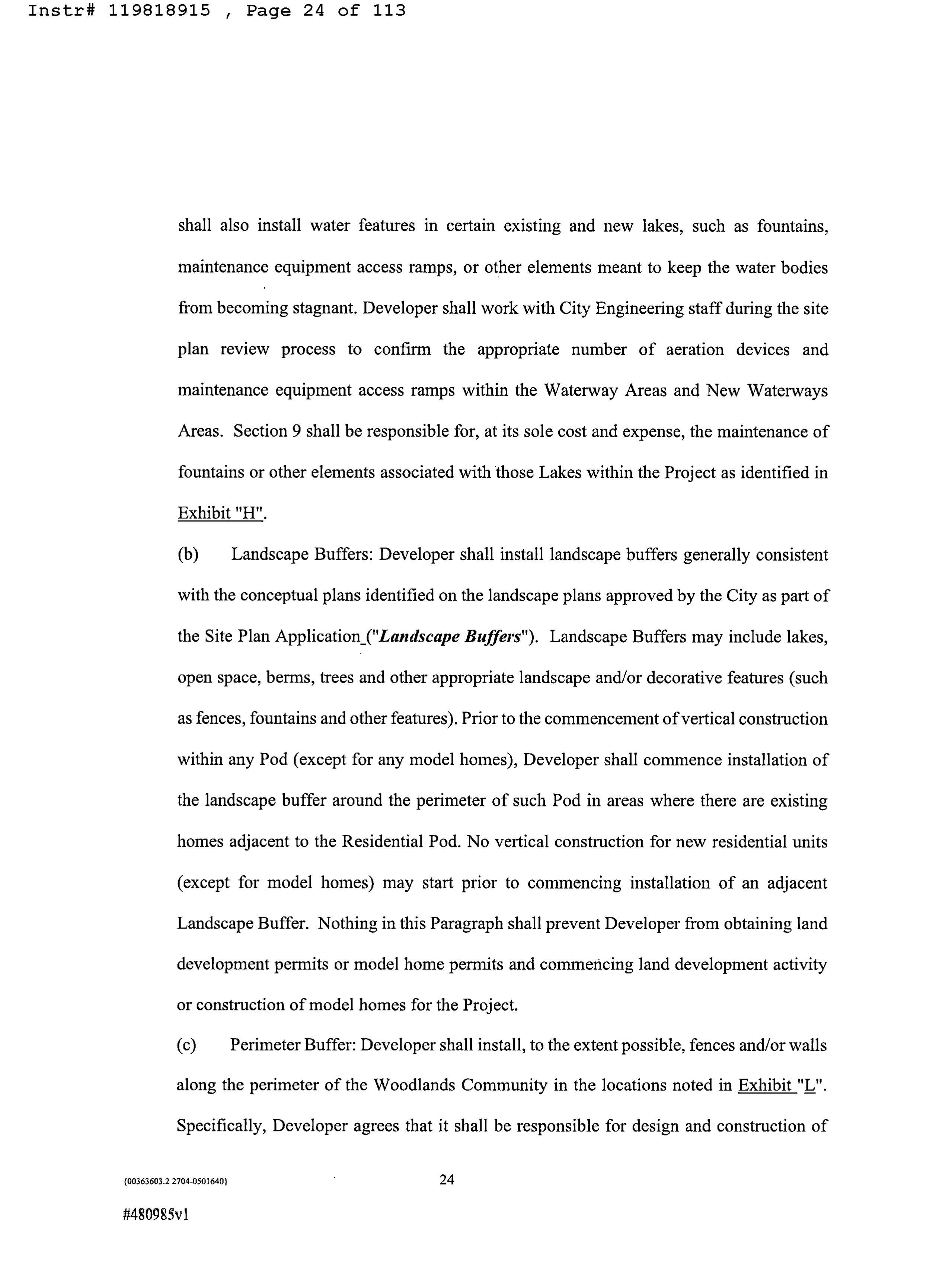 16. Project Buffers. The Developer shall install a mix of lakes, landscape buffers, buffer walls/ fencing and Open Space within and around the Residential Pods and Woodlands Community as identified on Exhibit "L", attached hereto and more specifically described below: