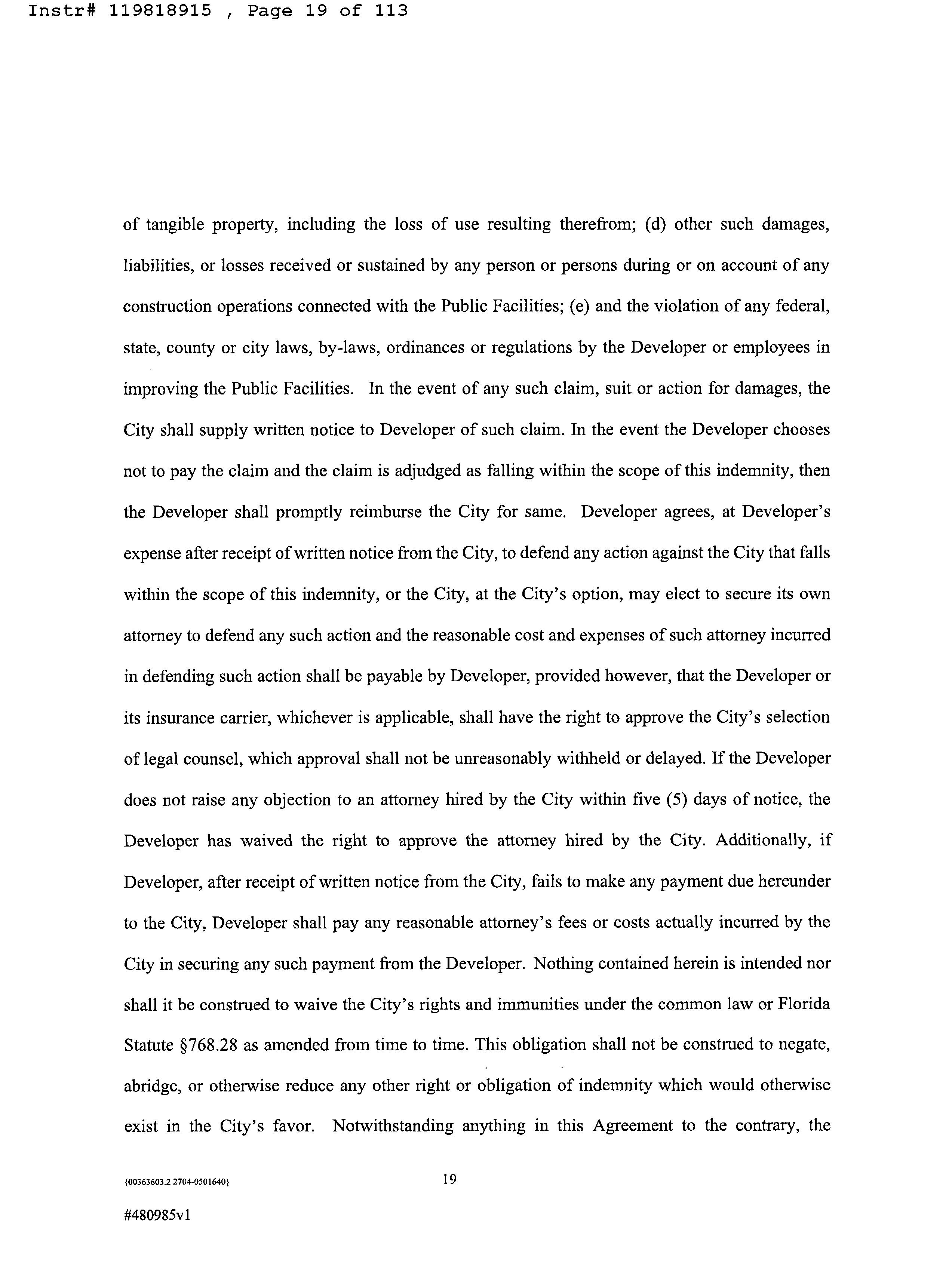 of tangible property, including the loss of use resulting therefrom; ( d) other such damages, liabilities, or losses received or sustained by any person or persons during or on account of any construction operations connected with the Public Facilities; ( e) and the violation of any federal, state, county or city laws, by- laws, ordinances or regulations by the Developer or employees in improving the Public Facilities. In the event of any such claim, suit or action for damages, the City shall supply written notice to Developer of such claim. In the event the Developer chooses not to pay the claim and the claim is adjudged as falling within the scope of this indemnity, then the Developer shall promptly reimburse the City for same. Developer agrees, at Developer' s expense after receipt ofwritten notice from the City, to defend any action against the City that falls within the scope of this indemnity, or the City, at the City' s option, may elect to secure its own attorney to defend any such action and the reasonable cost and expenses of such attorney incurred in defending such action shall be payable by Developer, provided however, that the Developer or its insurance carrier, whichever is applicable, shall have the right to approve the City' s selection of legal counsel, which approval shall not be unreasonably withheld or delayed. If the Developer does not raise any objection to an attorney hired by the City within five (5) days of notice, the Developer has waived the right to approve the attorney hired by the City. Additionally, if Developer, after receipt of written notice from the City, fails to make any payment due hereunder to the City, Developer shall pay any reasonable attorney' s fees or costs actually incurred by the City in securing any such payment from the Developer. Nothing contained herein is intended nor shall it be construed to waive the City' s rights and immunities under the common law or Florida Statute § 768.28 as amended from time to time. This obligation shall not be construed to negate, abridge, or otherwise reduce any other right or obligation of indemnity which would otherwise exist in the City' s favor. Notwithstanding anything in this Agreement to the contrary, the