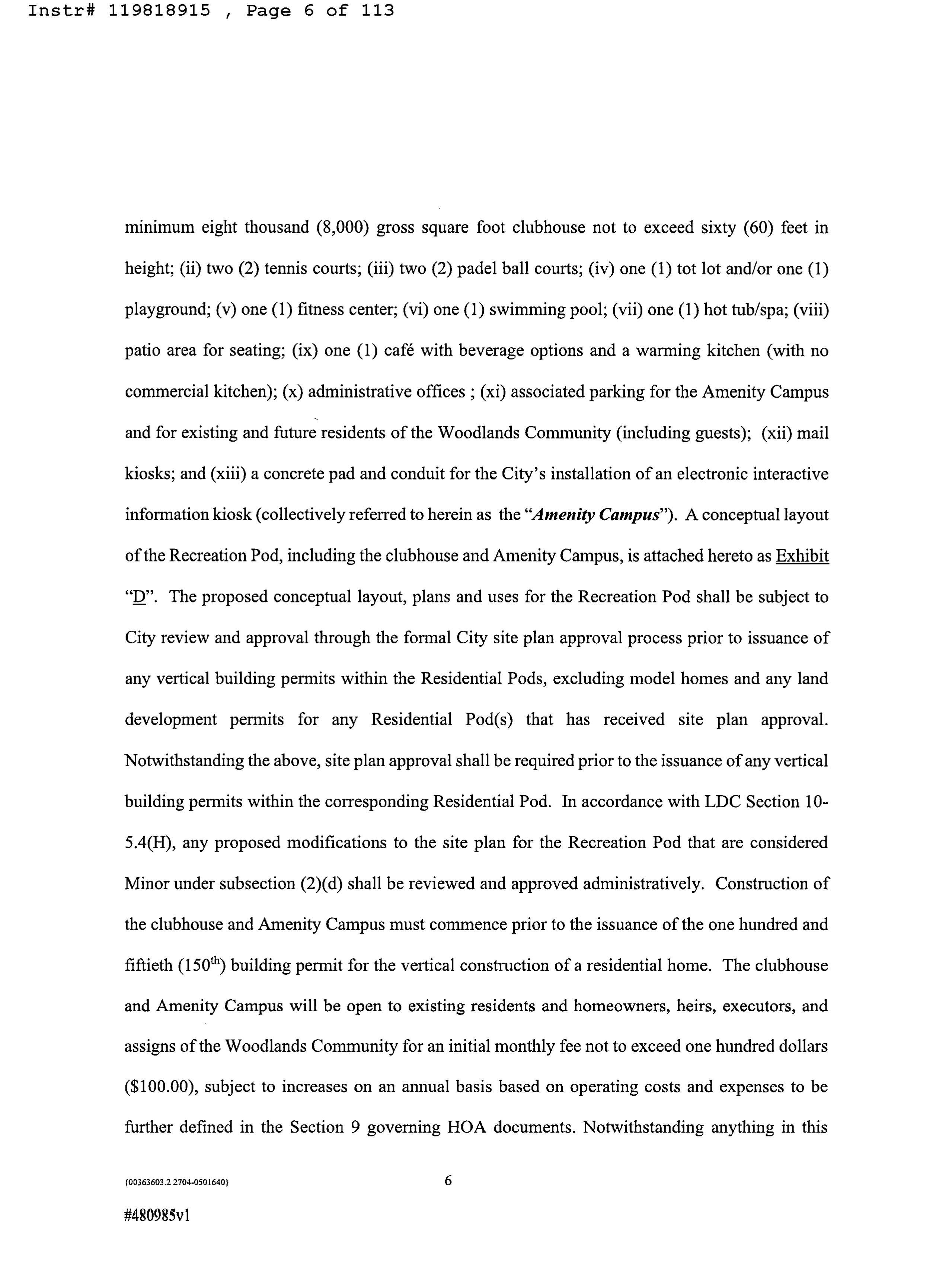 minimum eight thousand ( 8, 000) gross square foot clubhouse not to exceed sixty ( 60) feet in height; ( ii) two (2) tennis courts; ( iii) two (2) padel ball courts; ( iv) one ( 1) tot lot and/or one ( 1) playground; ( v) one ( 1) fitness center; ( vi) one ( 1) swimming pool; ( vii) one ( 1) hot tub/ spa; ( viii) patio area for seating; ( ix) one ( 1) caf6 with beverage options and a warming kitchen ( with no commercial kitchen); ( x) administrative offices ; ( xi) associated parking for the Amenity Campus and for existing and future residents of the Woodlands Conununity ( including guests); ( xii) mail kiosks; and ( xiii) a concrete pad and conduit for the City' s installation of an electronic interactive information kiosk (collectively referred to herein as the "Amenity Campus"). A conceptual layout of the Recreation Pod, including the clubhouse and Amenity Campus, is attached hereto as Exhibit D". The proposed conceptual layout, plans and uses for the Recreation Pod shall be subject to City review and approval through the formal City site plan approval process prior to issuance of any vertical building permits within the Residential Pods, excluding model homes and any land development permits for any Residential Pod( s) that has received site plan approval. Notwithstanding the above, site plan approval shall be required prior to the issuance of any vertical building permits within the corresponding Residential Pod. In accordance with LDC Section 105. 4( H), any proposed modifications to the site plan for the Recreation Pod that are considered Minor under subsection ( 2)( d) shall be reviewed and approved administratively. Construction of the clubhouse and Amenity Campus must commence prior to the issuance ofthe one hundred and fiftieth (150th) building permit for the vertical construction ofa residential home. The clubhouse and Amenity Campus will be open to existing residents and homeowners, heirs, executors, and assigns of the Woodlands Community for an initial monthly fee not to exceed one hundred dollars 100. 00), subject to increases on an annual basis based on operating costs and expenses to be further defined in the Section 9 governing HOA documents. Notwithstanding anything in this