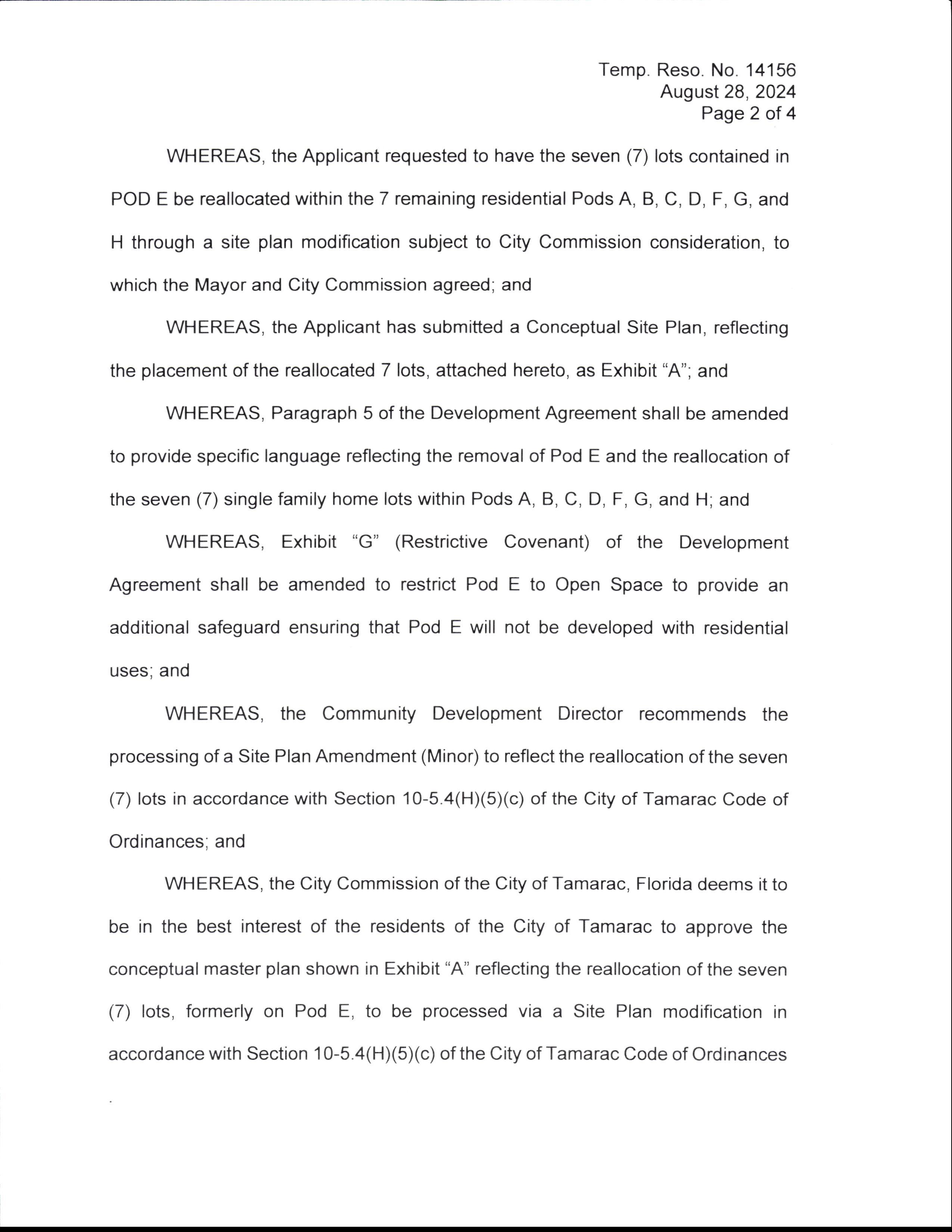 Plan. The seven ( 7) lots not currently reflected on the Site Plan, as a result of the removal of Pod E, as agreed to during the November 8, 2023 City Commission meeting, may be added through a site plan modification processed at a public hearing before the City Commission and in accordance with the City' s LDC. For the avoidance of doubt, Pod E has been removed as a residential pod.