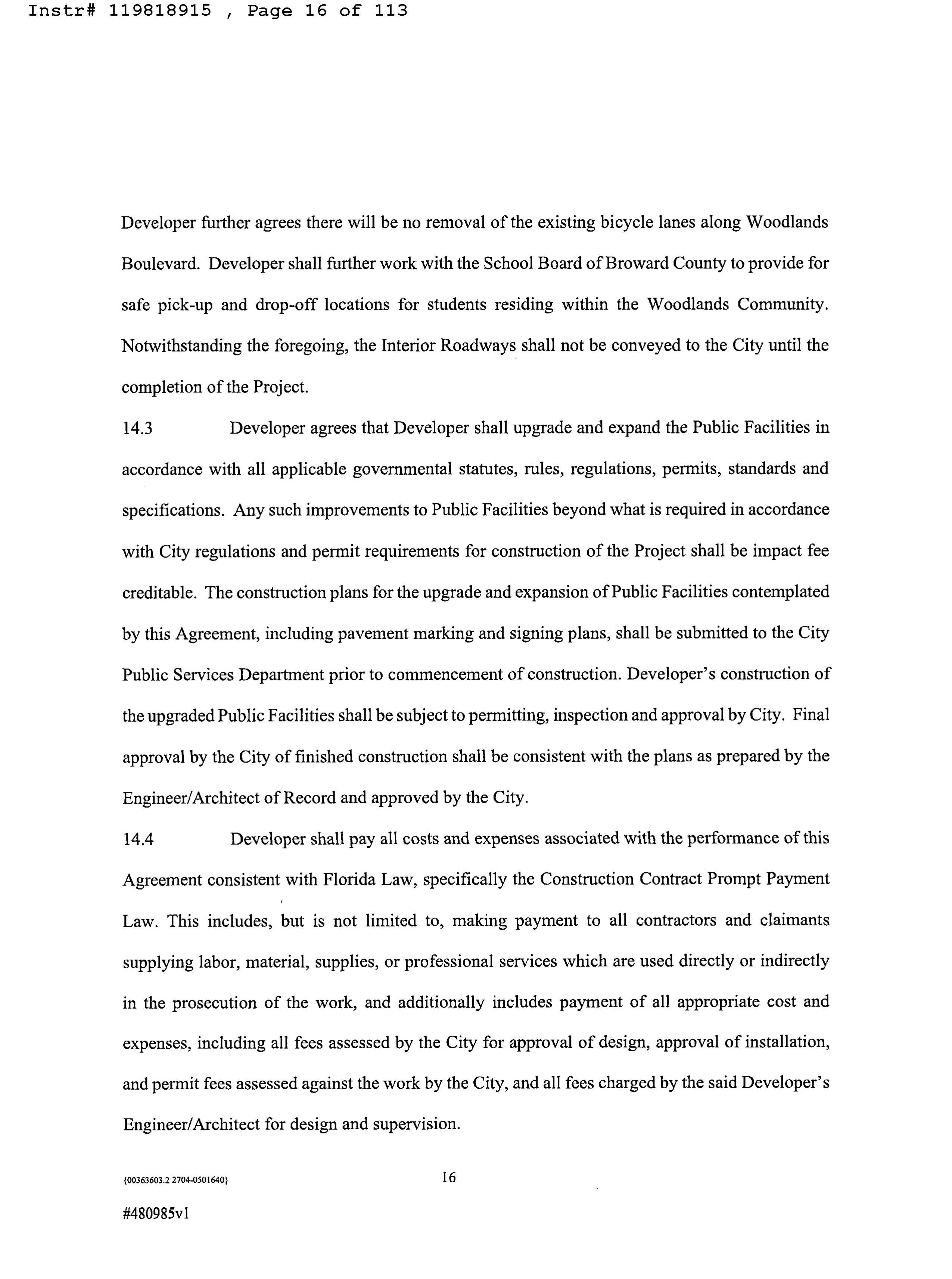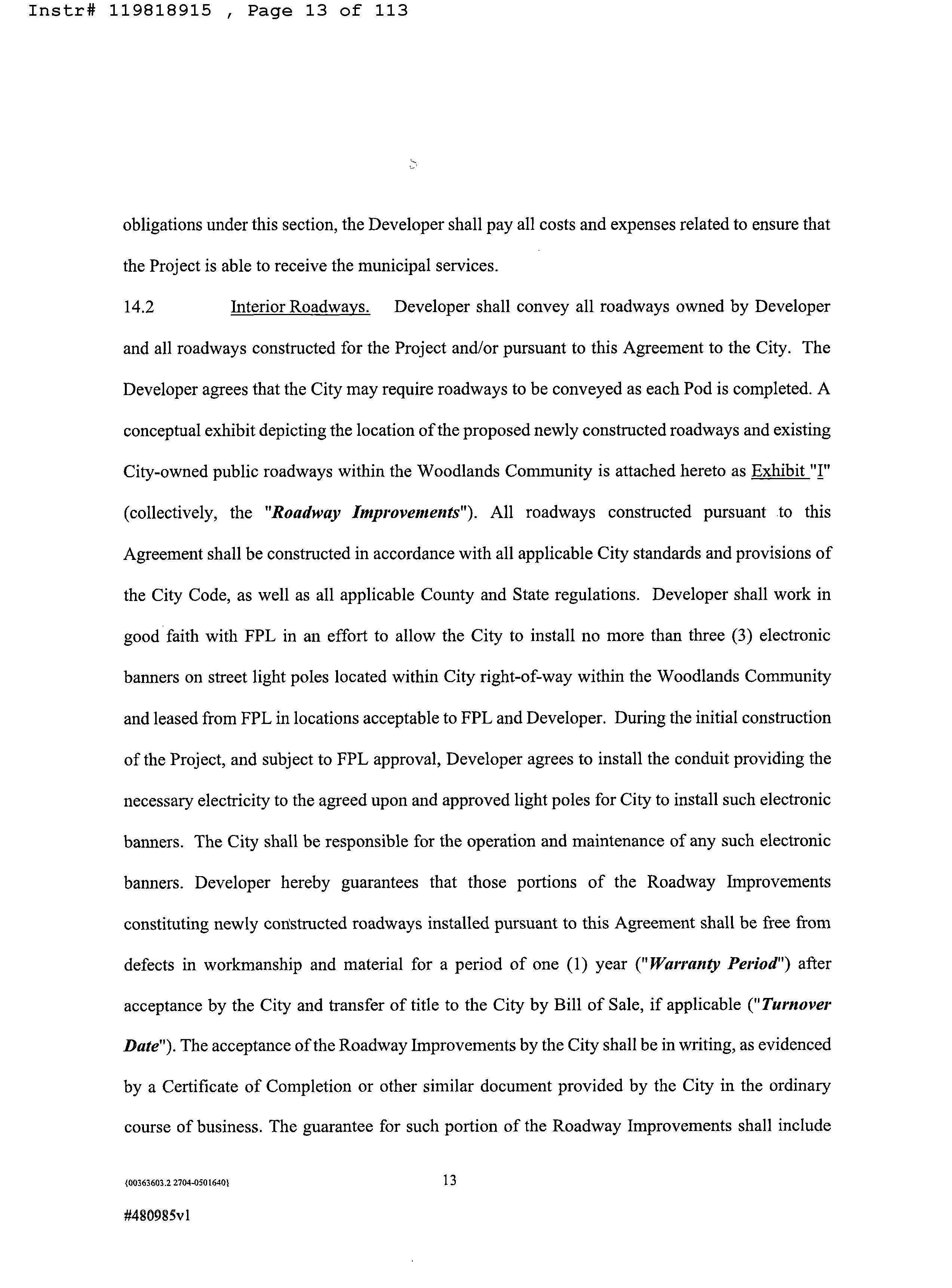 obligations under this section, the Developer shall pay all costs and expenses related to ensure that the Project is able to receive the municipal services. 14.2 Interior Roadways. Developer shall convey all roadways owned by Developer and all roadways constructed for the Project and/or pursuant to this Agreement to the City. The Developer agrees that the City may require roadways to be conveyed as each Pod is completed. A conceptual exhibit depicting the location ofthe proposed newly constructed roadways and existing City -owned public roadways within the Woodlands Community is attached hereto as Exhibit " I" collectively, the " Roadway Improvements"). All roadways constructed pursuant . to this Agreement shall be constructed in accordance with all applicable City standards and provisions of the City Code, as well as all applicable County and State regulations. Developer shall work in good faith with FPL in an effort to allow the City to install no more than three ( 3) electronic banners on street light poles located within City right-of-way within the Woodlands Community and leased from FPL in locations acceptable to FPL and Developer. During the initial construction of the Project, and subject to FPL approval, Developer agrees to install the conduit providing the necessary electricity to the agreed upon and approved light poles for City to install such electronic banners. The City shall be responsible for the operation and maintenance of any such electronic banners. Developer hereby guarantees that those portions of the Roadway Improvements constituting newly constructed roadways installed pursuant to this Agreement shall be free from defects in workmanship and material for a period of one ( 1) year (" Warranty Period") after acceptance by the City and transfer of title to the City by Bill of Sale, if applicable (" Turnover Date"). The acceptance ofthe Roadway Improvements by the City shall be in writing, as evidenced by a Certificate of Completion or other similar document provided by the City in the ordinary course of business. The guarantee for such portion of the Roadway Improvements shall include
