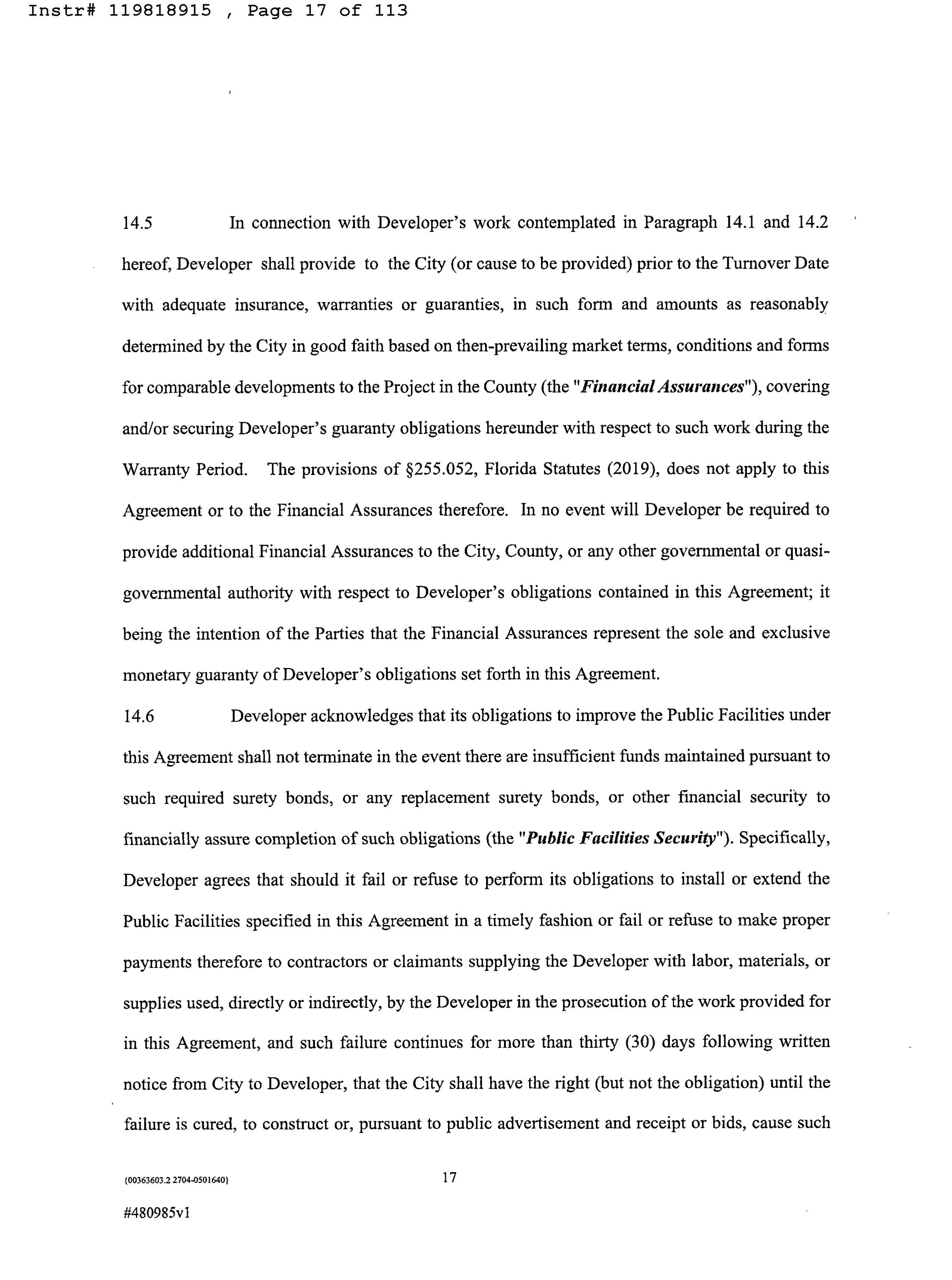 14.5 In connection with Developer' s work contemplated in Paragraph 14. 1 and 14. 2 hereof, Developer shall provide to the City ( or cause to be provided) prior to the Turnover Date with adequate insurance, warranties or guaranties, in such forin and amounts as reasonably determined by the City in good faith based on then -prevailing market terms, conditions and forms for comparable developments to the Project in the County (the " Financial Assurances"), covering and/or securing Developer's guaranty obligations hereunder with respect to such work during the Warranty Period. The provisions of §255. 052, Florida Statutes ( 2019), does not apply to this Agreement or to the Financial Assurances therefore. In no event will Developer be required to provide additional Financial Assurances to the City, County, or any other governmental or quasigovernmental authority with respect to Developer' s obligations contained in this Agreement; it being the intention of the Parties that the Financial Assurances represent the sole and exclusive monetary guaranty ofDeveloper' s obligations set forth in this Agreement.