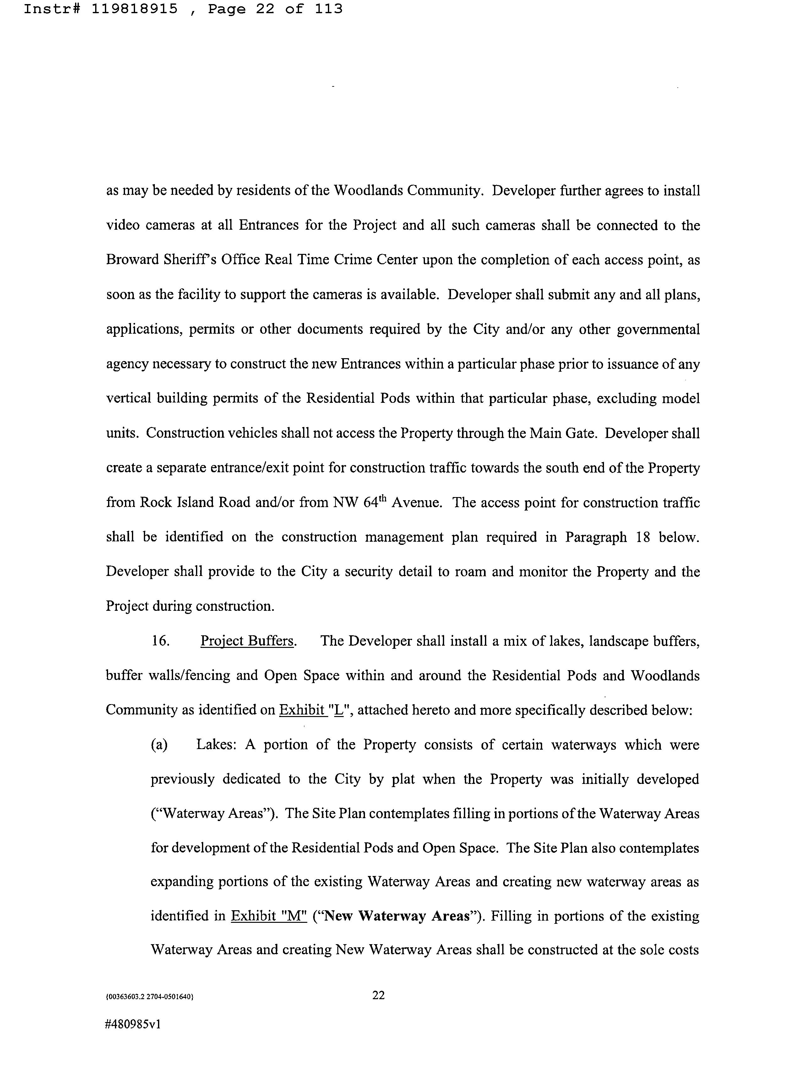 as may be needed by residents of the Woodlands Community. Developer further agrees to install video cameras at all Entrances for the Project and all such cameras shall be connected to the Broward Sheriff' s Office Real Time Crime Center upon the completion of each access point, as soon as the facility to support the cameras is available. Developer shall submit any and all plans, applications, permits or other documents required by the City and/ or any other governmental agency necessary to construct the new Entrances within a particular phase prior to issuance of any vertical building permits of the Residential Pods within that particular phase, excluding model units. Construction vehicles shall not access the Property through the Main Gate. Developer shall create a separate entrance/ exit point for construction traffic towards the south end of the Property from Rock Island Road and/ or from NW 641h Avenue. The access point for construction traffic shall be identified on the construction management plan required in Paragraph 18 below. Developer shall provide to the City a security detail to roam and monitor the Property and the Project during construction.