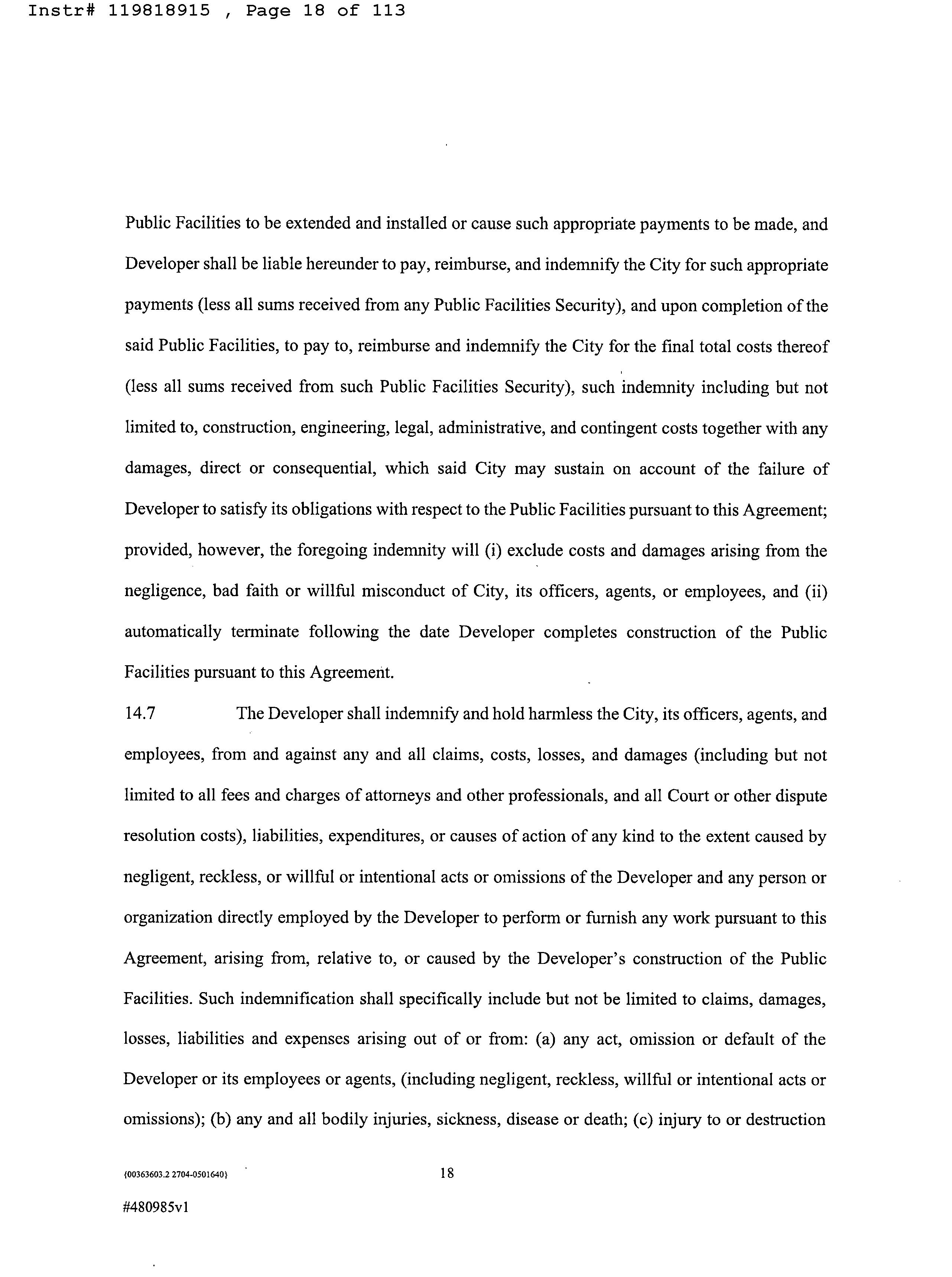 14. 7 The Developer shall indemnify and hold harmless the City, its officers, agents, and employees, from and against any and all claims, costs, losses, and damages ( including but not limited to all fees and charges of attorneys and other professionals, and all Court or other dispute resolution costs), liabilities, expenditures, or causes of action of any kind to the extent caused by negligent, reckless, or willful or intentional acts or omissions ofthe Developer and any person or organization directly employed by the Developer to perform or furnish any work pursuant to this Agreement, arising from, relative to, or caused by the Developer' s construction of the Public Facilities. Such indemnification shall specifically include but not be limited to claims, damages, losses, liabilities and expenses arising out of or from: ( a) any act, omission or default of the Developer or its employees or agents, ( including negligent, reckless, willful or intentional acts or omissions); ( b) any and all bodily injuries, sickness, disease or death; ( c) injury to or destruction