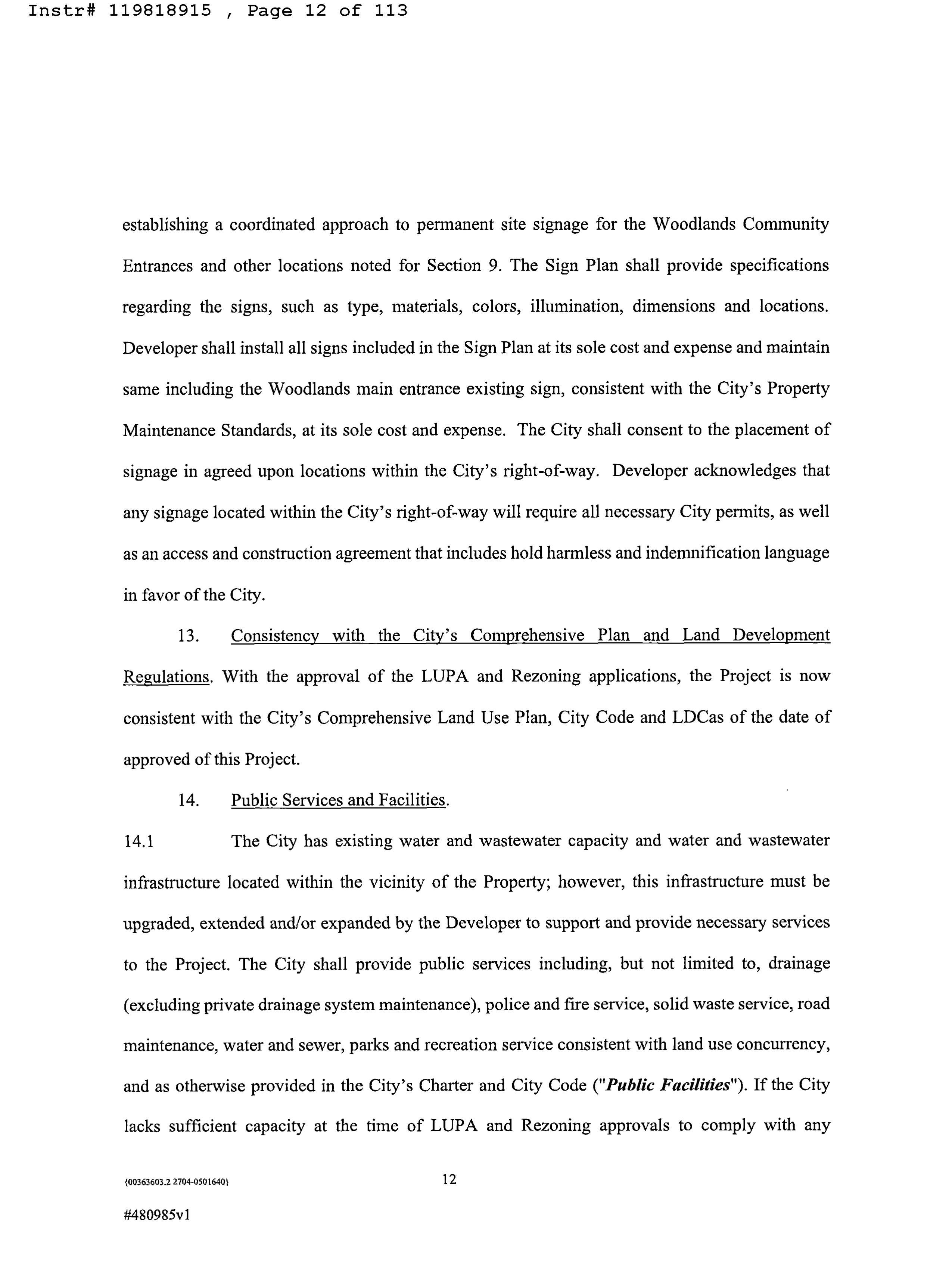 establishing a coordinated approach to permanent site signage for the Woodlands Community Entrances and other locations noted for Section 9. The Sign Plan shall provide specifications regarding the signs, such as type, materials, colors, illumination, dimensions and locations. Developer shall install all signs included in the Sign Plan at its sole cost and expense and maintain same including the Woodlands main entrance existing sign, consistent with the City' s Property Maintenance Standards, at its sole cost and expense. The City shall consent to the placement of signage in agreed upon locations within the City' s right-of-way. Developer acknowledges that any signage located within the City' s right-of-way will require all necessary City permits, as well as an access and construction agreement that includes hold harmless and indemnification language in favor of the City.