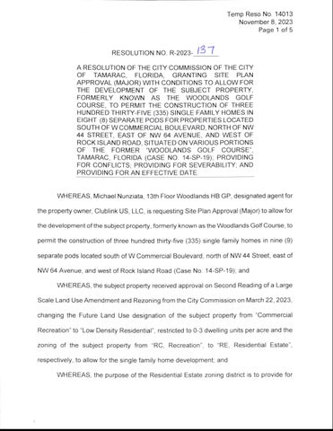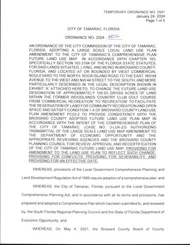 WHEREAS, Developer is the contract purchaser of approximately two hundred seventy five ( 275) acres of private property formerly utilized as two ( 2) 18- hole golf courses with a clubhouse, parking, recreation, and related facilities legally described on the attached Exhibit " A" Property"), which lies adjacent to the Woodlands residential community comprised of eight (8) individual sections of homes that are generally bounded by Commercial Boulevard on the north, Rock Island Road on the east, NW 441h Street on the south and NW 64th Avenue on the west