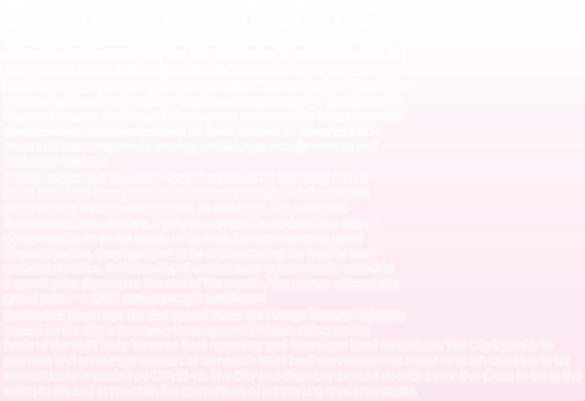 Flavors Ta m a ra c , Resta ura nt B ing o ga m e was a m onth - long e con omic d eve lopm e nt initiative d esign e d to draw patrons to Ta m a ra c ’s 6 0 + m om a n d p op resta ura nt s se r ving d e licio us , culturally dive rse a n d a uth e ntic cuisin es .