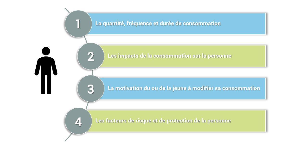 Cette phase d’échange est nécessaire pour ajuster la suite de la prise en charge en fonction du vécu de la personne, de ses valeurs, de ses connaissances sur les substances psychoactives et de son environnement. Le positionnement professionnel sera non stigmatisant, non jugeant et permettra aux jeunes de se responsabiliser : soutenir ne signifie pas cautionner les consommations, mais reconnaître les difficultés.