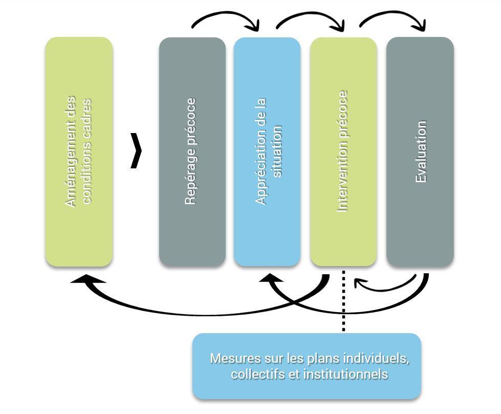 Aménagement des conditions cadres : il s’agit de toutes les mesures qu’une institution ou un organisme met en place pour permettre le repérage et l’intervention précoce C’est en quelques sortes le niveau organisationnel, financier. Un tel cadre facilite la mise en place de mesures destinées à favoriser le développement des jeunes.