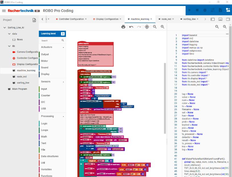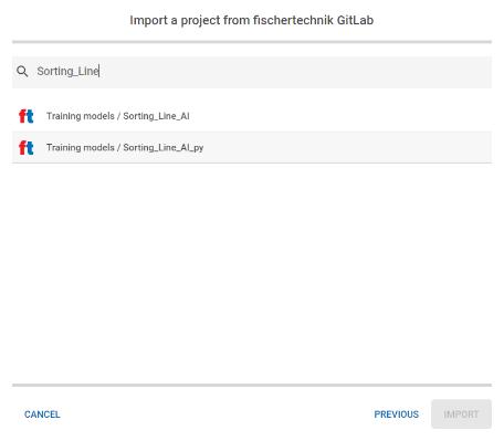 1. Start ROBO Pro Coding and import the relevant program, e.g. “Sorting_Line_AI” from the fischertechnik Gitlab: