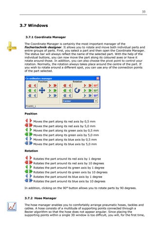 3.7 Windows 3.7.1 Coordinate Manager The Coordinate Manager is certainly the most important manager of the fischertechnik-designer. It allows you to rotate and move both individual parts and entire groups of parts. First, you select a part and then open the Coordinate Manager. The status bar will always reflect the name of the selected part. With the help of the individual buttons, you can now move the part along its coloured axes or have it rotate around those. In addition, you can also choose the pivot point to control your rotation. Normally, the rotation always takes place around the centre of the part. If you wish to rotate around a different spot, you can use any of the connection points of the part selected.