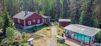 2 h, k + saunamökki + grillikatos. Rakennukset asettuvat pihapiirissä niin, että toiminnallisen kokonaisuus huomioitu. Helppohoit., luonnonvarainen tontti 6.650 m². Tie perille, sähköt sekä porakaivo. Mh. 59.000 €.