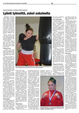 Lyönti lyönniltä, askel askeleelta (Raasepori) Nyrkkeilyn nuorten SM-kisoissa Tikkurilassa todistettiin piinaavan tasaista finaalia B-tyttöjen 66 kilon sarjassa. Järvenpään jykevälyöntinen Viivi Jokinen hallitsi ensimmäistä erää Veera Karlssonia vastaan, mutta peloton Bollstan plikka alkoi laittaa kakkoserässä kiivaasti kampoihin. Kolmannessa erässä haastaja pääsi jo niskan päälle ja lopputulos oli arvailujen varassa. Tuomio suosi Jokista, eikä Karlsson vieläkään saanut tutun taistelutoverin päänahkaa vyölleen. Ottelun päätyttyä Veera riensi kiireen vilkkaa lehtereille isänsä Kimmon kainaloon. Tämä kummasteli, mikä mahtaa olla hätänä, kun tytär niin itkuun purskahti. -Itken herkästi, mutta en siksi että hävisin. Minusta tuntui, että oikeasti osaan tämän homman ja se oli iso hetki, Veera kertoo. Onnen kyyneleitä lienee tällä tahdilla luvassa lisääkin.