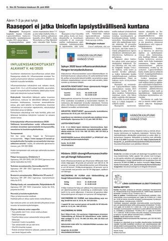 VACCINERING AV BARN Barn i åldern 6 mån - 6 år vaccineras i rådgivningens utrymmen. Tidsbeställning på förhand till hälsovårdarna under telefontider vardagar kl. 11-12. Tfn 040 135 9521, 040 135 9522 och 040 135 9525. SKOLELEVER SOM HÖR TILL RISKGRUPPERNA kontaktar skolhälsovårdarna. Hangö den 26.10.2020 HÄLSOVÅRDSCENTRALEN