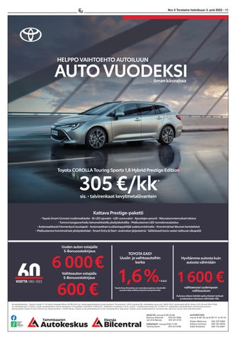 Esimerkkilaskelma: Toyota Corolla TS 1.8 Hybrid Prestige Edition 28.582,36 € sis. talvirengasyhdistelmä ja toimituskulut. Perustamisk. 249 €, käsiraha 0€, rahoitettava osuus yht. 28.831,36 €, rahoitusaika 60 kk, Korko 1,6 %, kk-erä 305,47 €/kk sis. käsittelymaksu 12 €/erä, Lohjan autokeskuksen sitova ostotarjous 12 kk jälkeen. Kilometrit 15 000 km/v. Todellinen vuosikorko 2,55 %. Luotto + luottokustannukset yht. 31.490,71 €. Edellyttää luottopäätöksen ja kaskovakuutuksen. Rahoitusyhtiö Toyota Finance Finland Oy, Korpivaarantie 1, 01450 Vantaa. Tarjous ei ole yhdistettävissä muihin kampanjoihin/ tarjouksiin. Koskee uusia asiakastilauksia. Voimassa 28.2.2022 asti. Kuvan auto erikoisvarustein.