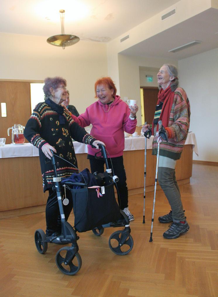 Riittävän energiatason säi lymisestä huolehti lämpiössä järjestetty kahvitarjoilu. Tau olla tunnelma oli korkealla. Paikalla olivat myös Pirjo Nuutinen rollaattorinsa kans sa ja Eeva Pesonen kävelysau voineen.
