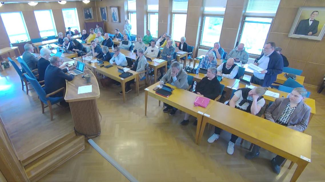 Rolf Nyström (sit) ehdotti sopimuksen palauttamista, mutta ei saanut kannatusta, vaikka yhtä ja toista toivetta salista vielä kuuluikin. (Kuva: Hangon kaupungin kokouslähetys)
