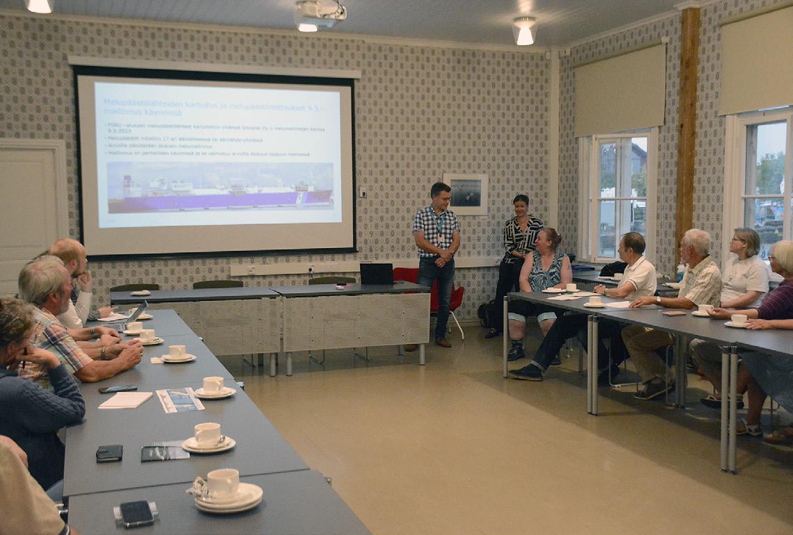 Projektipäällikkö Timo Korkee esitteli asukkaille melumittausten tuloksia. Kaasuterminaaliyhtiön toimitusjohtaja Satu Mattila lupasi, että meluntorjuntakeinoja löytyy.