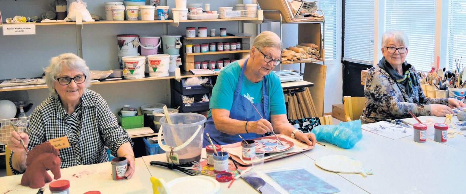 Kom som du är Borden och hyllorna i keramikverkstaden, som leds av konstnären Terttu Riippi, svämmar över av fantastiska konstverk. Vid det stora bordet sitter två konstnärliga seniorer, de andra har tagit en kaffepaus.