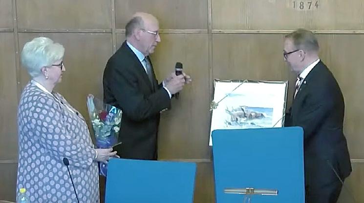 Kuluneen viikon valtuustokokous oli samalla viimeinen eläkepäiville pian siirtyvälle Denis Strandellille. Puheenjohtaja Aila Pääkkö (sd) sanoi kauniin kiitoksen yhteistyöstä ja luovutti kaupunginhallituksen puheenjohtaja Sture Söderholmin (r) kanssa kaupunginjohtajalle läksiäislahjaksi hankolaistaiteilija Esko Sihtolan maalaaman taulun. Valtuuston kokouslähetys verkossa keskeytettiin ennen Strandellin jäähyväispuhetta, josta Pääkkö vihjaisi kokouksen aluksi. Eläkkeelle siirtyvän Strandellin viimeinen työpäivä Hangon kaupungin palveluksessa on 31. maaliskuuta. Hän aloitti virassa vuoden 2015 syksyllä.