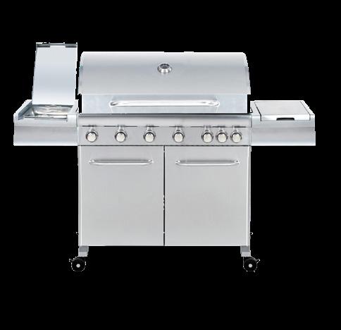 ruostumatonta terästä ja säätimessä integroitu sytytysjärjestelmä. Sisältää valurautaparilan. Teho: 10, 5kW + 2, 5kW grillausala: L