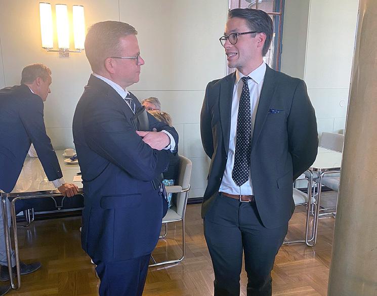Pääministeri Petteri Orpo ja kansanedustaja Henrik Wickström vaihtoivat ajatuksia kakkukahvien lomassa eduskunnassa. Taustalla Inkoon kunnanjohtaja Robert Nyman keskustelemassa siuntiolaispäättäjien kanssa.