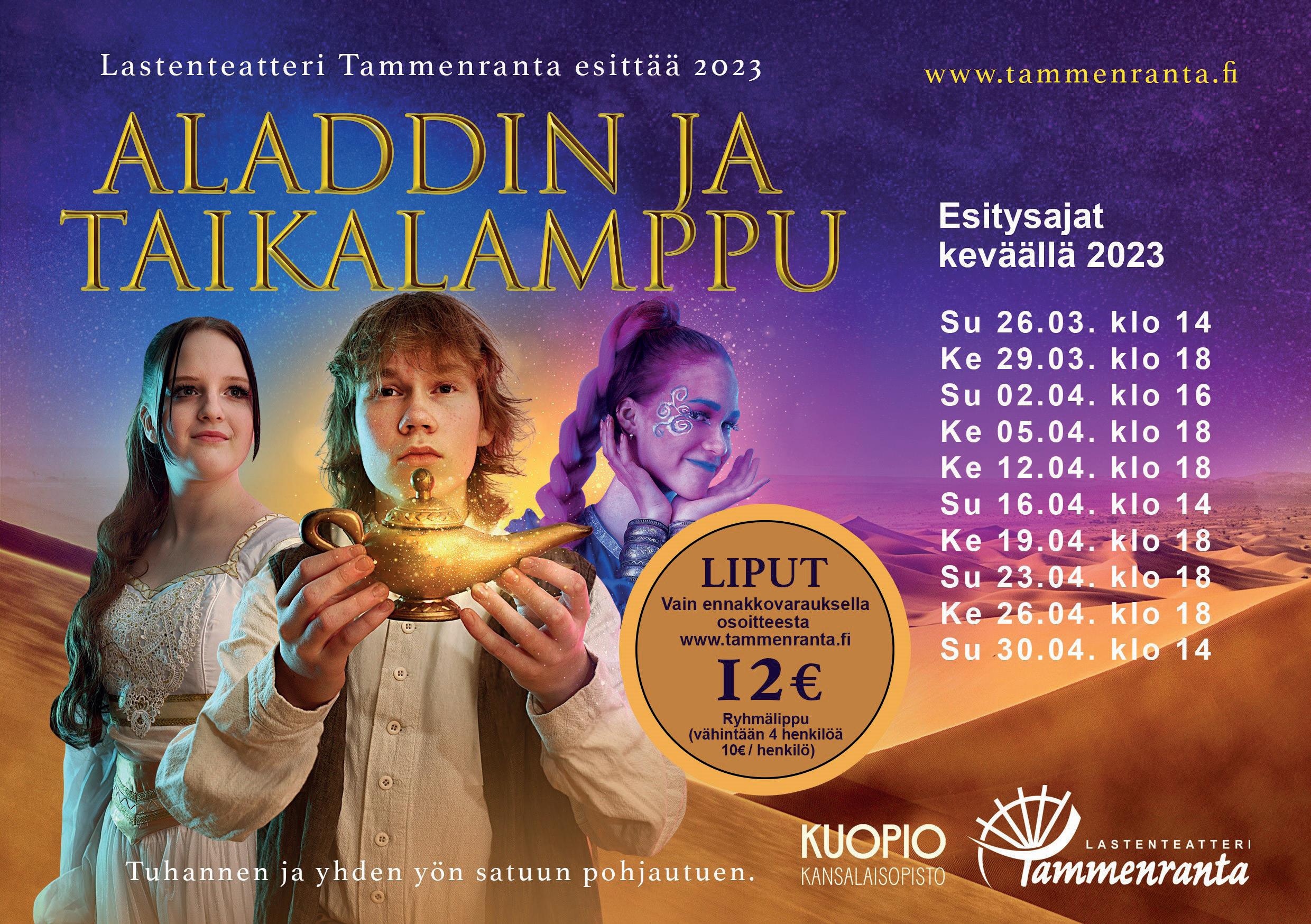 Istu siis lentävän maton kyytiin Aladdinin ja Jaden kaveriksi ja häikäistymään kimaltavasta sadusta. Muista varata liput hyvissä ajoin, sillä lumouskaan ei auta, jos näytös on loppuunmyyty. Esityksen kesto noin 1,5 tuntia väliajan kanssa.