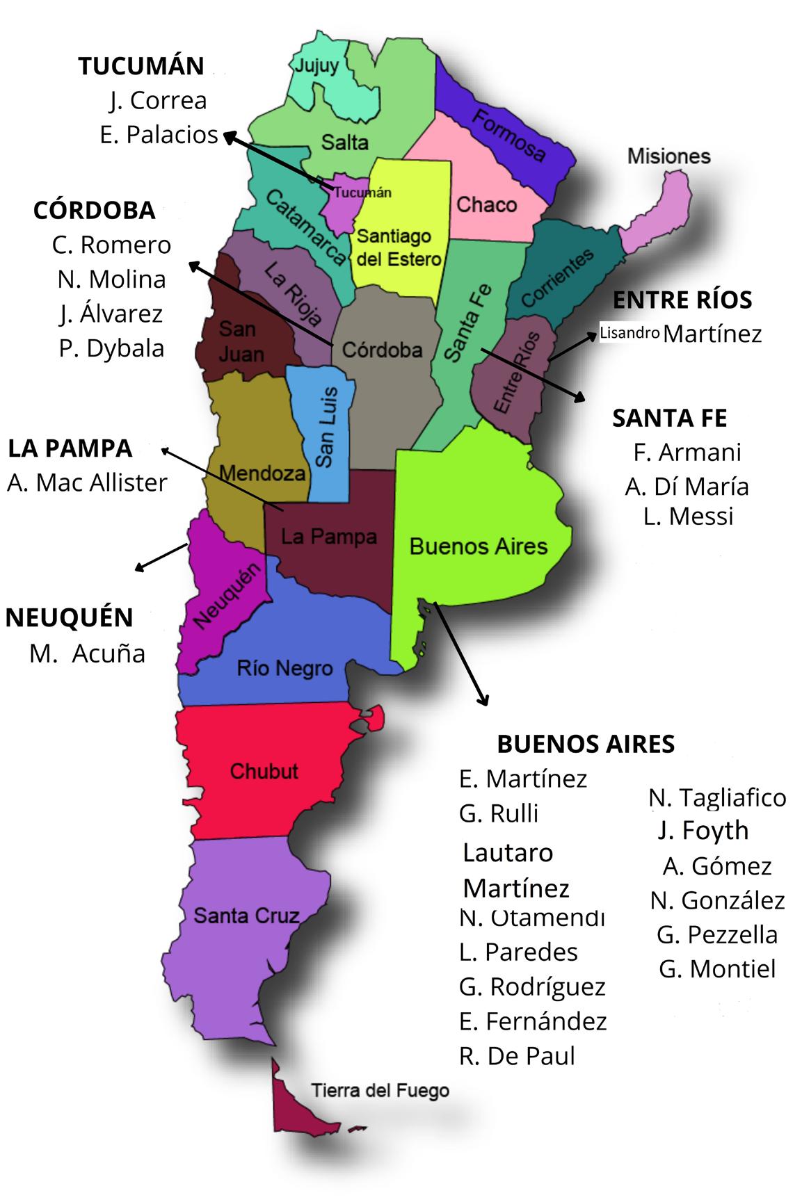 Buenos Aires, con 14, es la provincia que más jugadores aportó al equipo de Scaloni. Los restantes son de Córdoba (4), Santa Fe (3), Tucumán (2), Entre Ríos (1), La Pampa (1) y Neuquén (1).