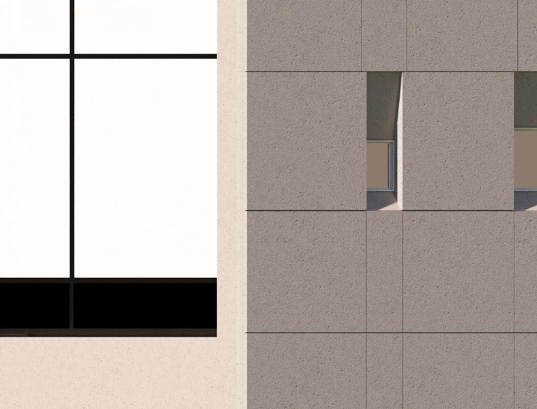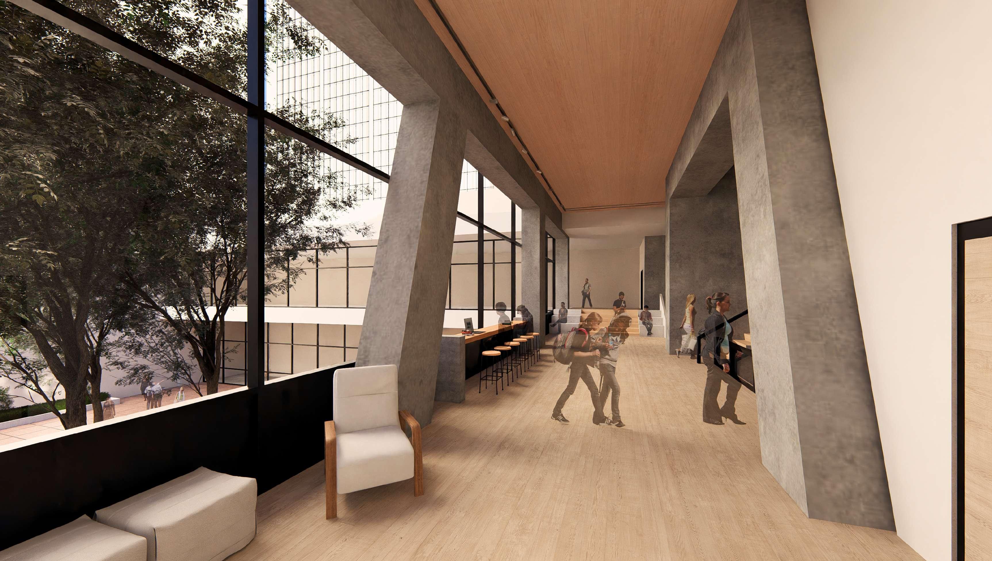 The form acts as a frame for the courtyard, capturing it and breaking walls. The exterior corner turns only on the top and bottom, shaping a void. The interior corner uses the existing building by stretching it into that same void. The interior spaces are derived from bounced light to target certain spaces. Glare is something that can ruin a space, so deleting it is emphasized. The angled form that has punched openings into the void acts subsequently as the structure for the frame. This allows for ample light and views while also creating a sacredness to the circulation. The sleek limestone frame feels pertinent when being held up by a more structural, rugged concrete. At times the concrete walls may be exposed, and at others they may be cladded to change the effect of the space.