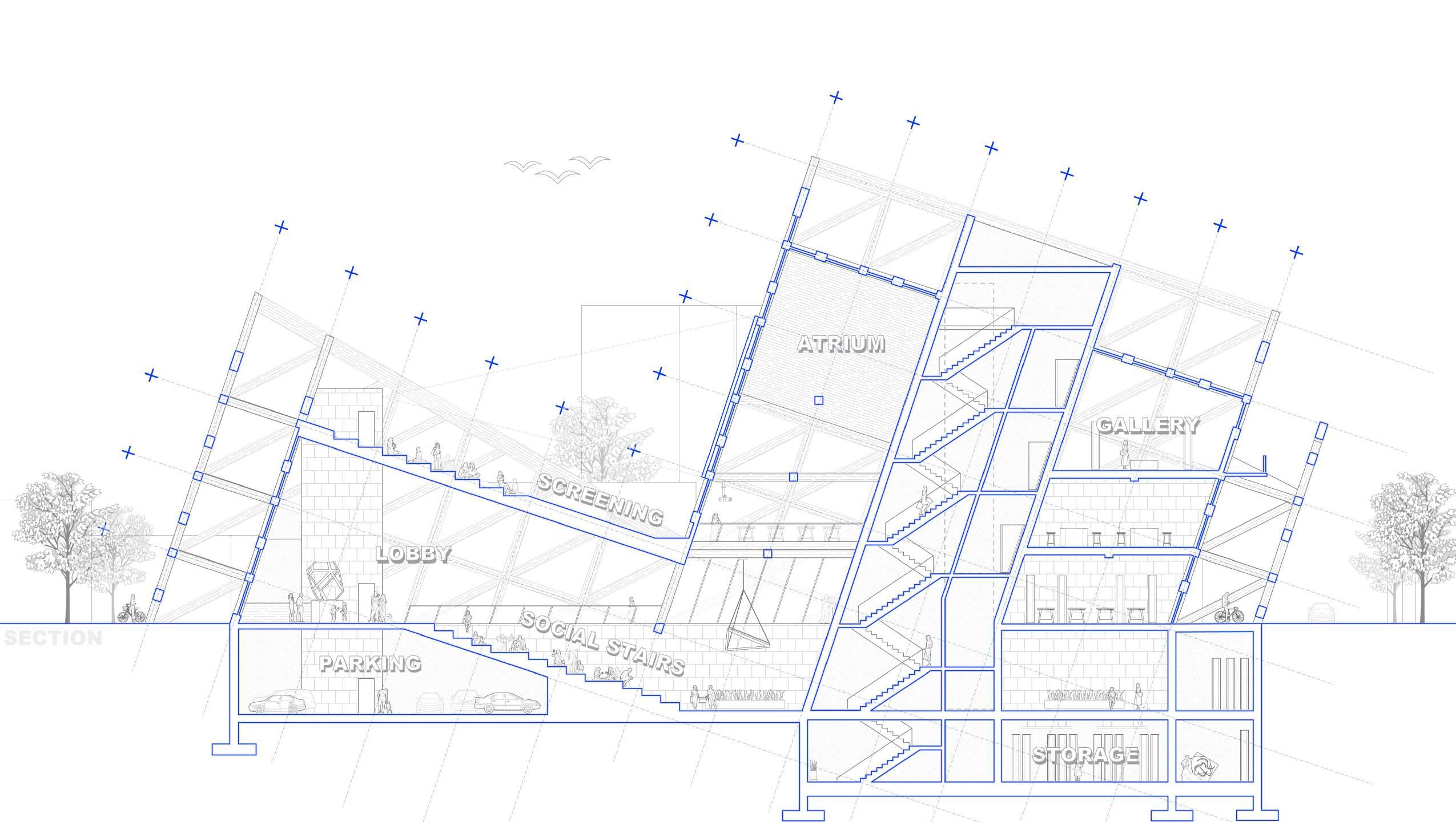 The Reelbox explores the cinematic experience through architecture. The carefully choreographed circulation guides visitors through a journey that mirrors the emotional rhythm of cinema. Beginning with moments of quiet intimacy within the lobby, it builds tension as users move through compressed spaces, ultimately culminating in grand reveals of the four-story atrium and monumental gallery spaces.