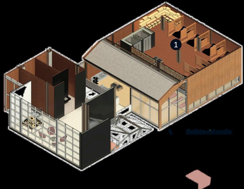 Adicionalmente el uso de ventanales estratégicamente ubicados en cada espacio permiten el aprovechamiento de la luz natural y radiación solar para mantener los espacios calients en momentos frios como las noches.