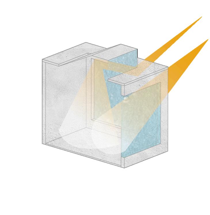 Debido a las condiciones climáticas, la topografía y ubicación del proyecto, la quinta fachada es la que mayor recepción a los rayos del sol tiene, por ende se proponen elementos denominados Triforios, con la intención de introducir esta radiación al interior de la vivienda, además de grandes ventanales en la fachadas mas largas que tambien tienen una gran recepción de la luz solar.