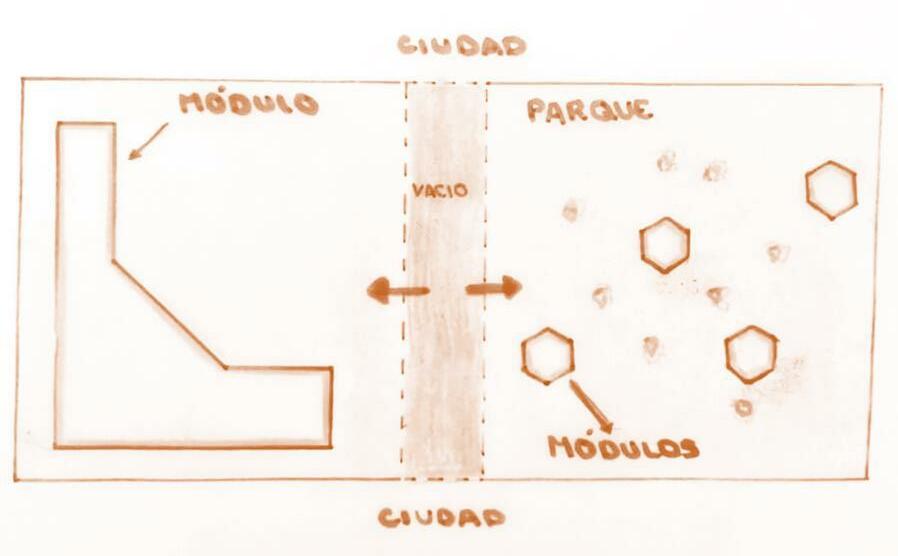 ● El edificio funciona como una puerta urbana y espacio integrador que vincula el parque y ciudad con el gesto generar un lleno y un vacío entres u pieza arquitectónica