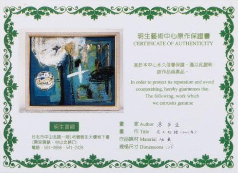 ※ 本拍賣會之競買人需於拍賣會前二日以身份證或持國 外身份證明文件,至本公司親自辦理競標牌號領取手 續,並 繳納保證金新台幣貮拾萬元整;如未能親自辦