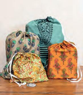 Reusable drawstring close bags made from colourful recycled sari fabric by fair trade producers in India. 36 x 50cm, 32 x 42cm, 30 x 32cm, 22 x 22cm. Colours will vary.