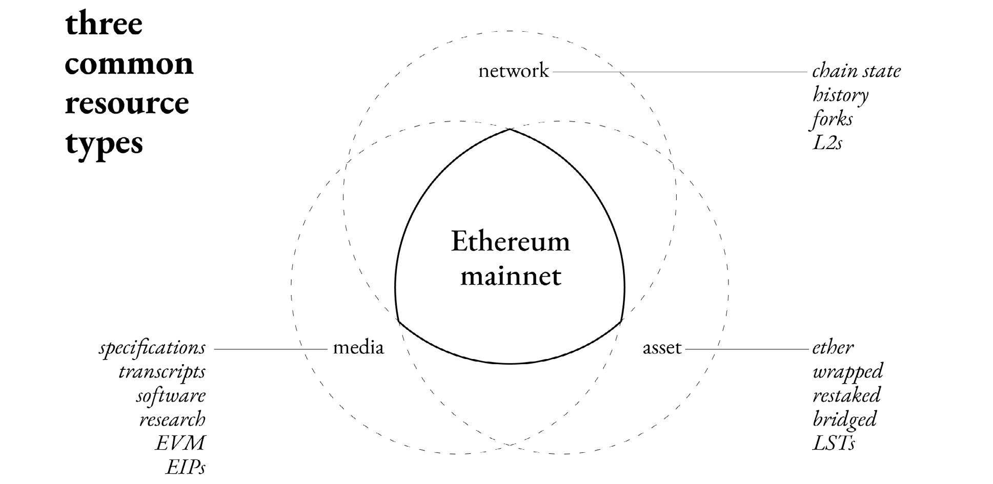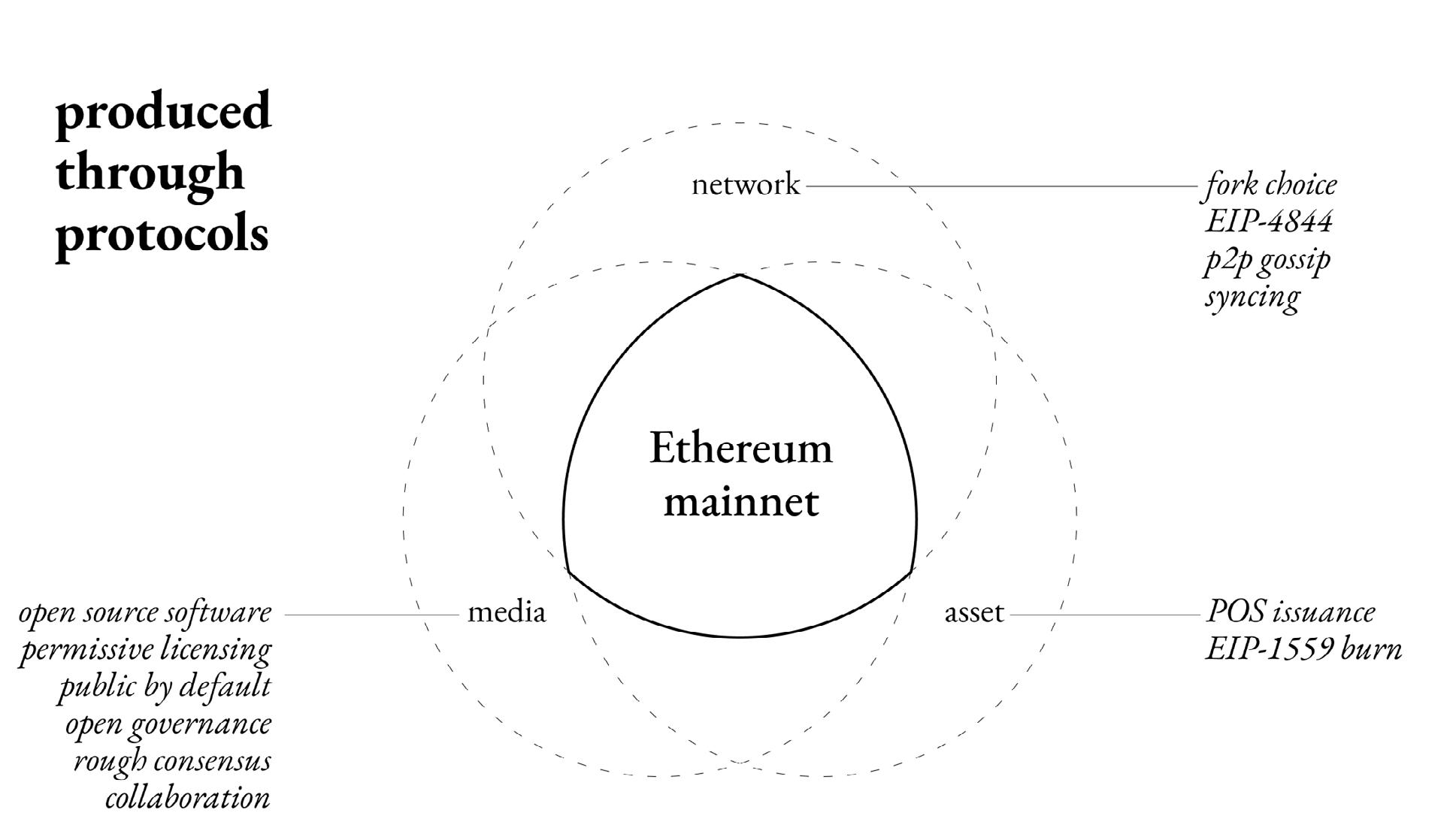 In Ethereum, sets of peers produce three resources: a blockchain network, an asset, and media. The way these resources are produced matters to their integrity and fundamental characteristics. These resources create a larger, valuable whole we call Ethereum. These interwoven resources can be extended outside of their original production contexts but still within the bounds of the broader commons.