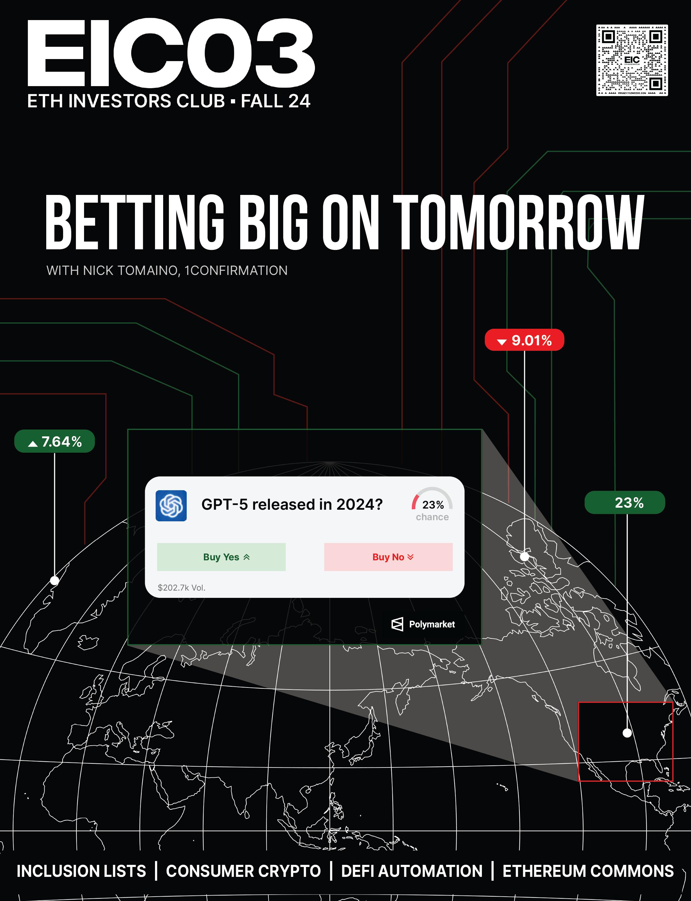 ETH Investors Club Quarterly aims to provide a snapshot of narratives, trends, reports, and analysis of the Ethereum ecosystem. This issue, in particular, includes several thought-provoking reports that had me questioning the role of AI and human connection as Ethereum grows. Réka Medvecz gets our collective gears turning with a theory on how DeFi automation may evolve (pg. 60); we examine a future where bots act as agents, further transforming how money is moved on the internet. How we, as human operators of the EVM, identify ourselves comes into question when Evin McMullen (pg. 53) goes deep on the evolving nature of ZK tech. For the policymakers among our readership, I encourage you to take a look at page 46 for an inviting piece by a team of researchers at Predicate (who, by the way, recently raised $7 million) on inclusion lists and how censorship continues to play a significant role in MEV redistribution.