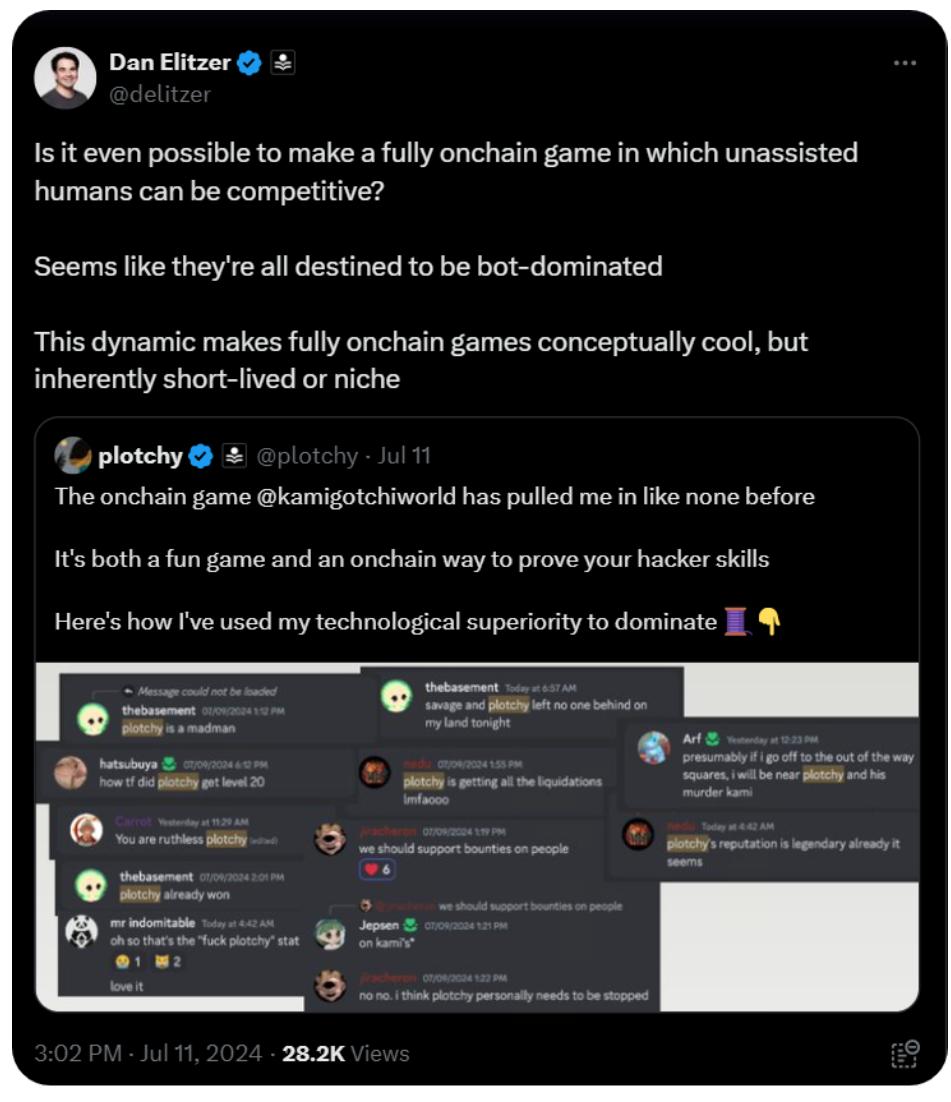 Elitzer asked the question in the context of a thread by plotchy, a security researcher at Nascent Security who has become a dominant force in Kamigotchi, a new fully onchain RPG I recently profiled in Metaversal.