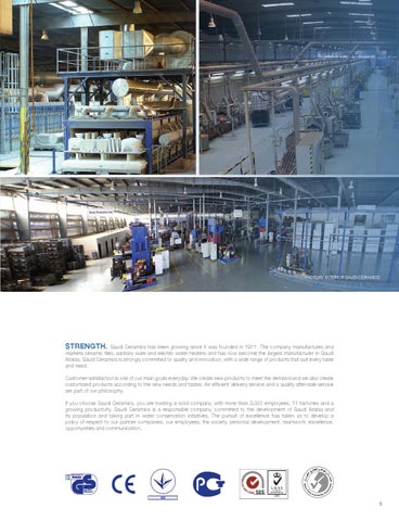 STRENGTH. Saudi Ceramics has been growing since it was founded in 1977. The company manufactures and markets ceramic tiles, sanitary ware and electric water heaters and has now become the largest manufacturer in Saudi Arabia. Saudi Ceramics is strongly committed to quality and innovation, with a wide range of products that suit every taste and need. Customer satisfaction is one of our main goals everyday. We create new products to meet the demand and we also create customized products according to the new needs and tastes. An efficient delivery service and a quality after-sale service are part of our philosophy. If you choose Saudi Ceramics, you are trusting a solid company, with more than 3,300 employees, 11 factories and a growing productivity. Saudi Ceramics is a responsible company, committed to the development of Saudi Arabia and its population and taking part in water conservation initiatives. The pursuit of excellence has taken us to develop a policy of respect to our partner companies, our employees, the society, personal development, teamwork, excellence, opportunities and communication.