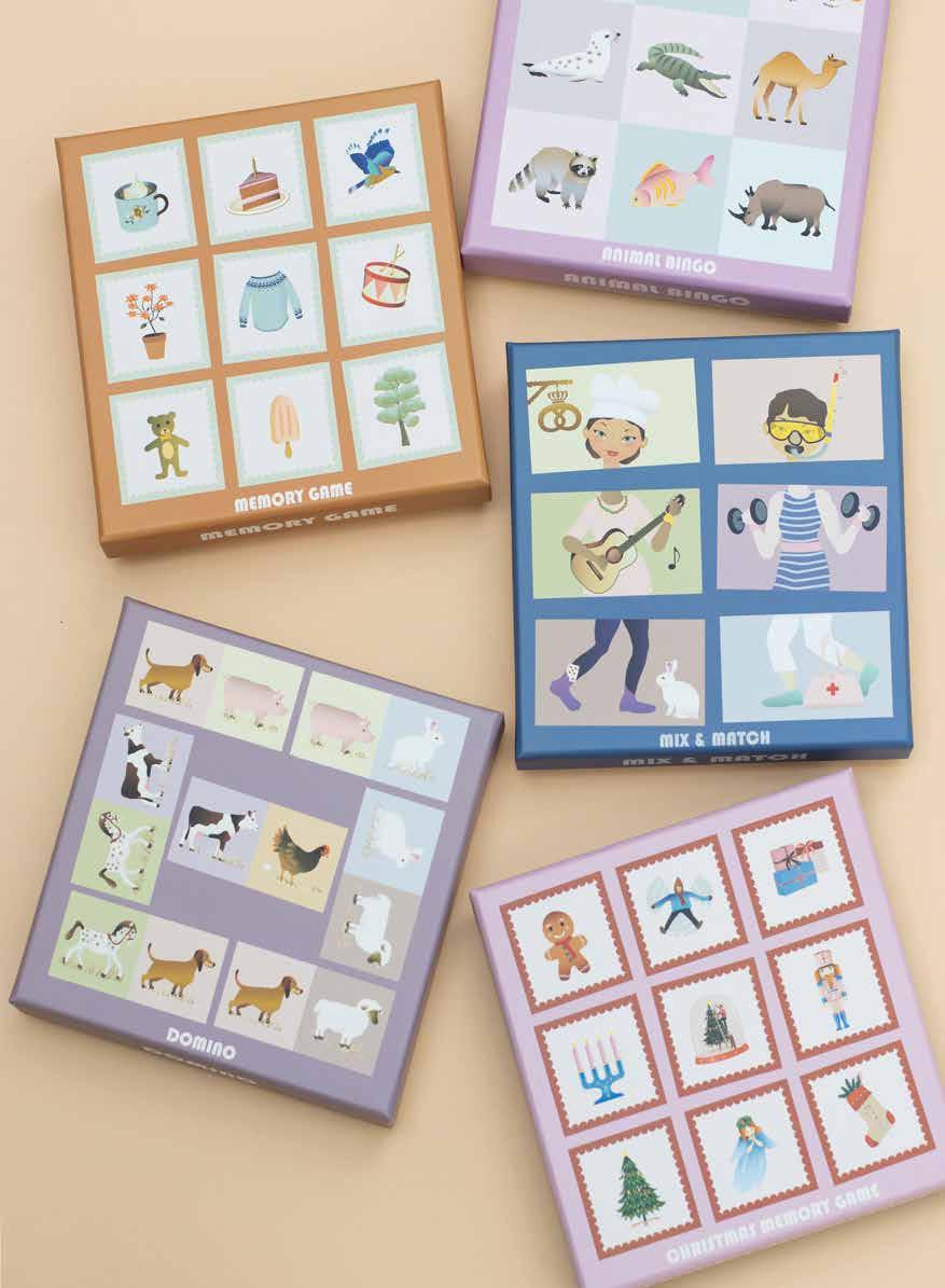 38 MEMORY GAME 28 pairs Box: 15 x 15 cm DOMINO 28 tiles Box: 15 x 15 cm ANIMAL BINGO Contains folder w. animal names 6 boards, 54 tiles Box: 15 x 15 cm MIX & MATCH 12 characters Box: 15 x 15 cm CHRISTMAS MEMORY GAME 28 pairs Box: 15 x 15 cm CHIMNEY PETE 31 cards (15 pairs) + 1 Chimney Pete PLAYING CARDS #01 52 cards 4 jokers