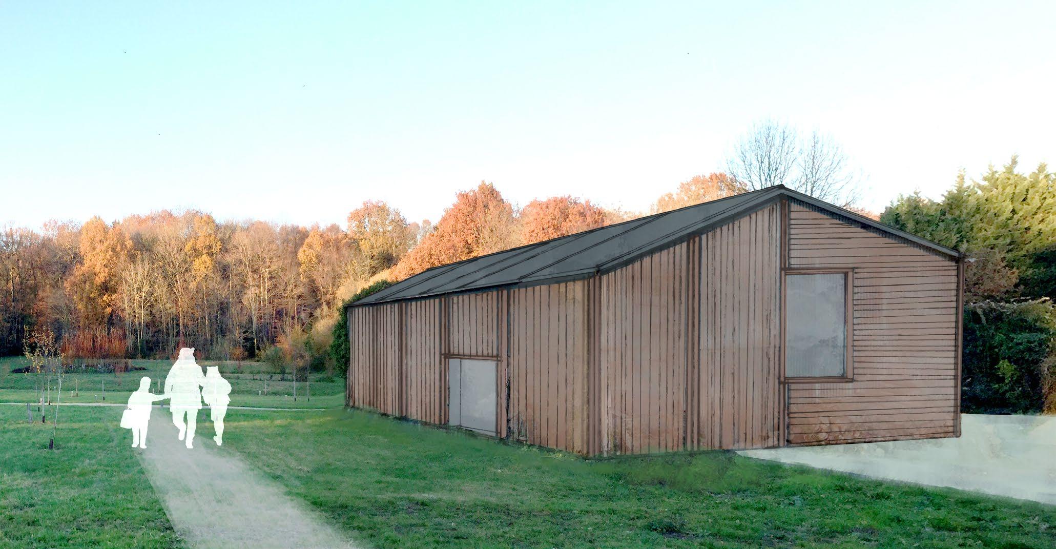 Croquis et photomontage pour la réhabilitation d’un bâtiment communal en bordure d’un arboretum